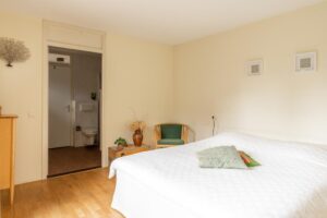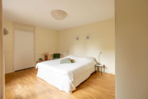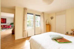 De slaapkamer is bereikbaar aan de achterzijde van de woonkamer. Ook hier vindt u weer een gelijke nette vloer- en wandafwerking. De slaapkamer is zeer ruim met 17 m2 en biedt dan ook volop ruimte voor een groot bed en veel kledingkasten. Plezierig is dat u ook vanuit de slaapkamer een deur hebt naar de tuin.