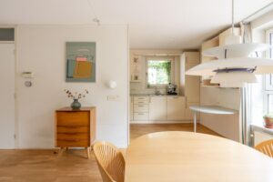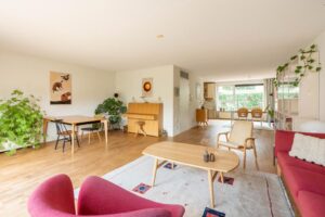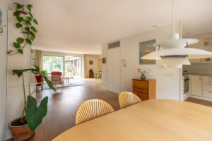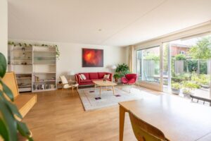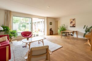 Over de hele woonkamer ligt op de vloer een massief houten parketvloer en de wanden zijn strak afgewerkt. Door de grote raampartijen aan zowel voor- als achterzijde is deze ruimte plezierig licht. Aan de voorzijde bij de keuken is de ideale plek voor een grote eettafel.