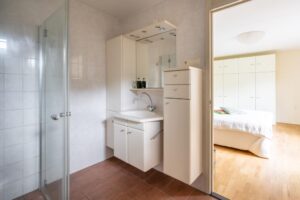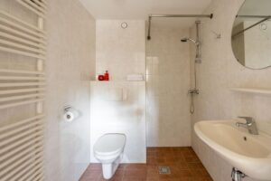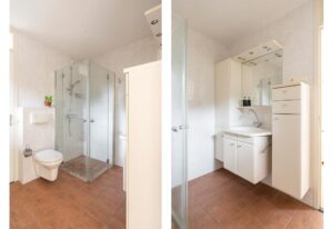 Achter de slaapkamer bevindt zich een nette en goed onderhouden badkamer met douche, whirlpool-bad, 2e toilet en wastafel met meubel.
