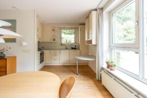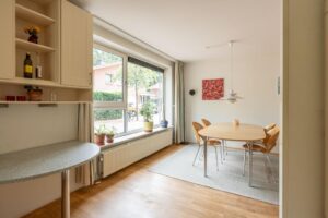 De keuken bevindt zich aan de voorzijde van de woning. Deze is in lichte kleurstelling en voorzien van inbouwapparatuur zoals een 4-pits inductie kookplaat, vaatwasser, oven en koelkast. De ruime keuken is in L- opstelling en voorzien van een vast tafelblad voor bijvoorbeeld een klein ontbijt of een eerste kopje koffie in de ochtend.