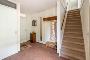 Via de overdekte entree komt u in de ruime en lichte hal met toilet met fonteintje, trapopgang, meterkast, garderobe en toegang tot zowel de garage als de woonkamer. Op de vloer ligt een rustieke, tegelvloer, de wanden zijn net afgewerkt.