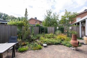 De besloten patiotuin heeft een gunstige ligging op het zuiden en zorgt daarmee voor veel licht in zowel de tuin als in het huis. Er is een ruim terras met grote groene borders. Een tuin die eenvoudig te onderhouden is en tegelijkertijd een fijne plek is om te vertoeven. De verlichting onder de overstekken aan de gevel zorgt voor een fijne belichting in de avond. In de tuin is ook nog een tuinkast voor al uw tuingereedschap.