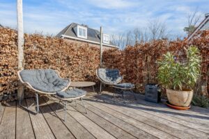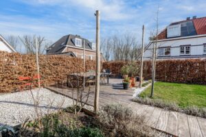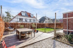 De tuin is ruim opgezet en gunstig gelegen op de zon, waardoor gedurende de dag altijd wel een fijne plek in de zon te vinden is. Er zijn twee terrassen aangelegd: één met voldoende ruimte voor een grote eettafel om heerlijk buiten te dineren en aangrenzend een tweede terras voor een comfortabele zithoek. Vanuit de tuin geniet je van een prettig vrij uitzicht over de wijk en het bos dat direct grenst aan het wijkje. Daarnaast biedt de voortuin ook een fijne plek waar je een zithoek kunt creëren om van de laatste avondzon te genieten.