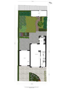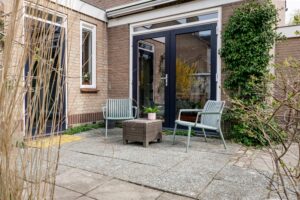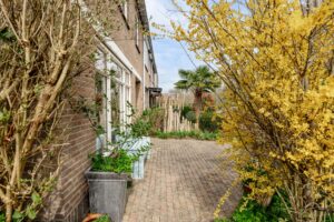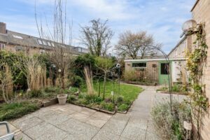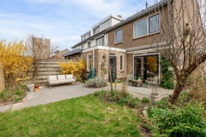 De verzorgde en zeer ruime achtertuin ligt op het westen en biedt verrassend veel zon. Door de breedte van het perceel zijn verschillende terrassen te maken, zowel direct aan de gevel van de woning als aan de achterzijde, bij de gevel van de berging. De hele dag is er in de tuin wel een zonnig of juist beschut plekje te vinden. De tuin is verzorgd aangelegd met bestrating en diverse beplanting.
