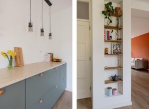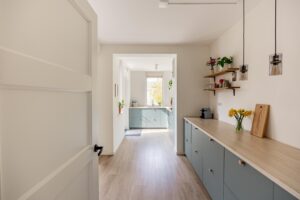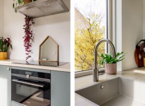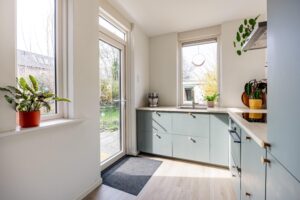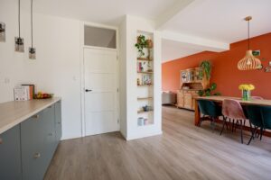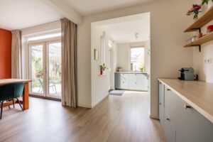Via de hal kom je aan de voorzijde van woning waar een heerlijke living is gemaakt. De grote raampartijen geven de woning veel licht en je kijkt hier weg in het groen van het Waterwingebied. De woonkamer grenst aan de eetkamer die tuingericht is. Wat een fijne, lichte ruimte; door de openslaande deuren valt het licht naar binnen. Aan de achterzijde bevindt zich de moderne open keuken in een ruime L-opstelling. De keuken (2021) is voorzien van inbouwapparatuur, waaronder een inductiekookplaat met afzuigkap, combi-oven/magnetron, koel-vriescombinatie en een vaatwasser. De keuken heeft extra veel kasten en werkblad waardoor je plek hebt voor een heerlijke koffiecorner.