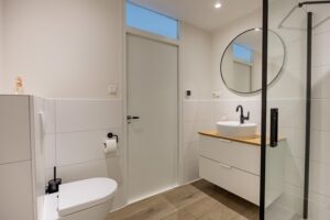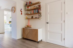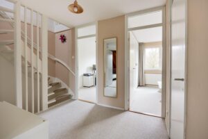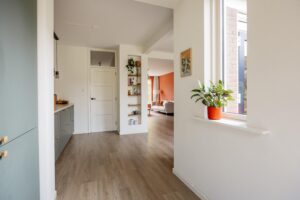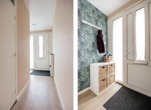 Je komt binnen in de hal met meterkast, toilet, trapopgang en trapkast. Op de vloer ligt een keurige pvc-vloer die doorloopt naar woonkamer en keuken. Op de hele begane grond is vloerverwarming geplaatst voor extra comfort. Het toilet is modern afgewerkt en voorzien van fonteintje.