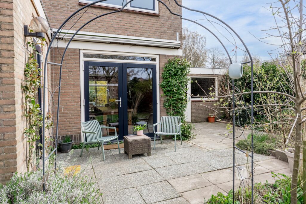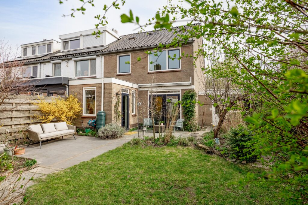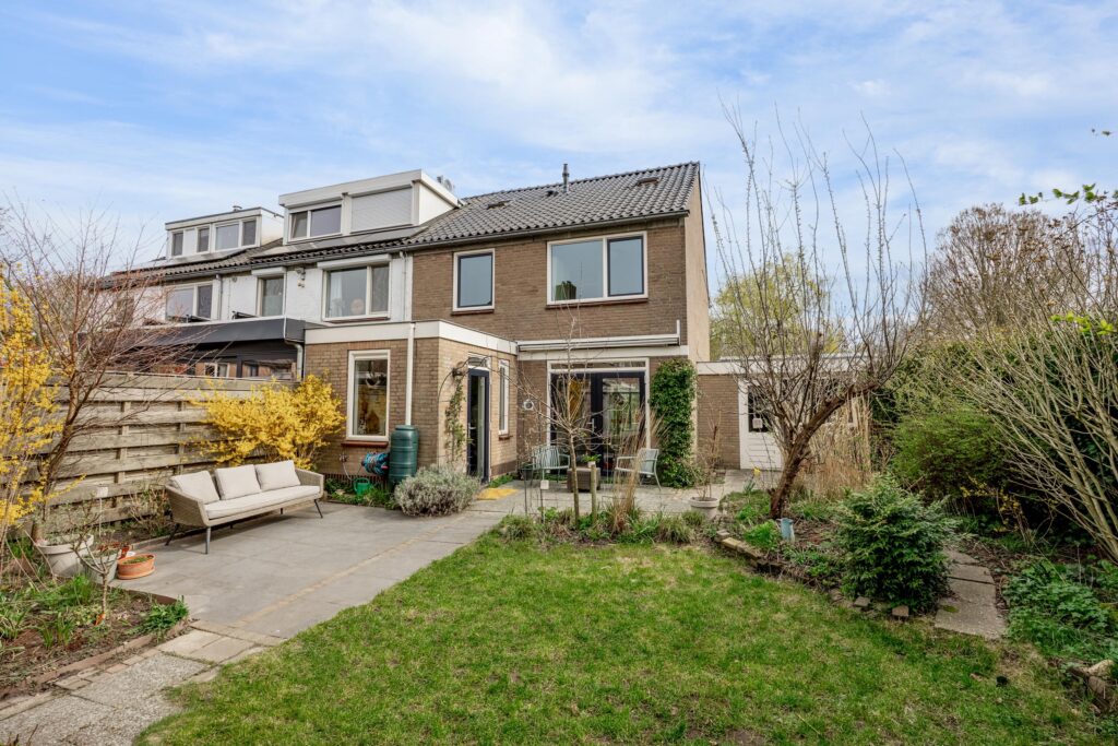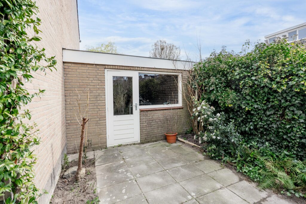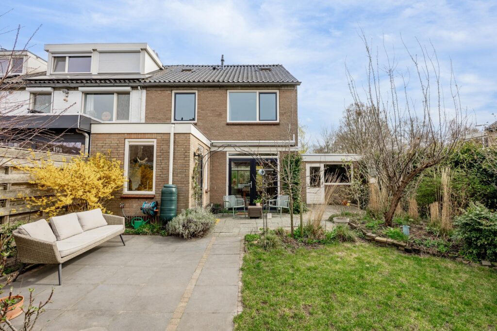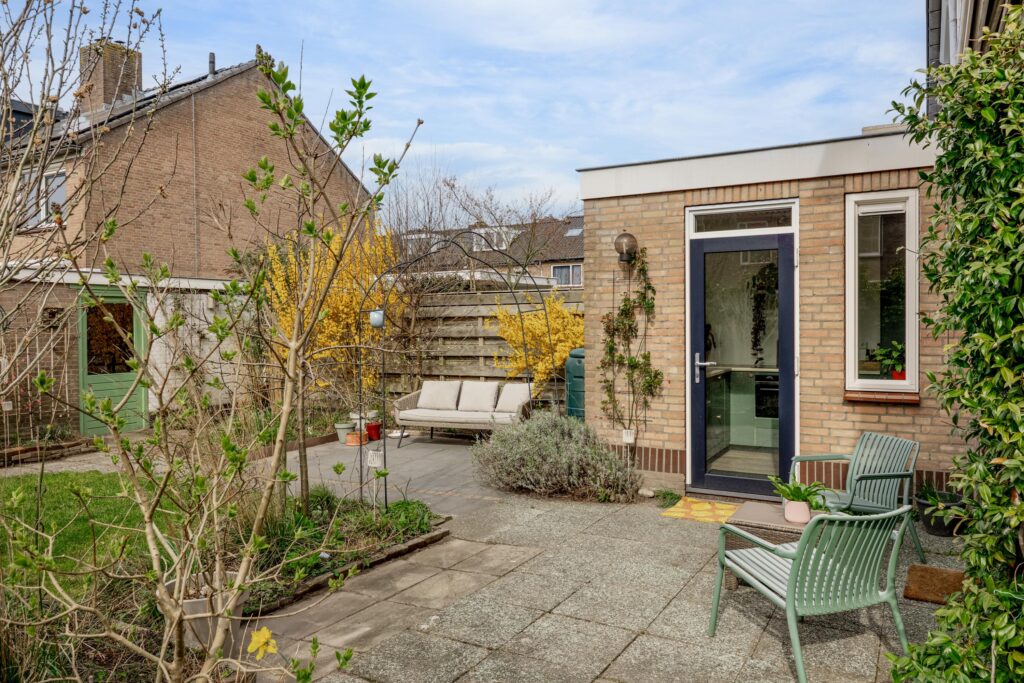 De verzorgde en zeer ruime achtertuin ligt op het westen en biedt verrassend veel zon. Door de breedte van het perceel zijn verschillende terrassen te maken, zowel direct aan de gevel van de woning als aan de achterzijde, bij de gevel van de berging. De hele dag is er in de tuin wel een zonnig of juist beschut plekje te vinden. De tuin is verzorgd aangelegd met bestrating en diverse beplanting.