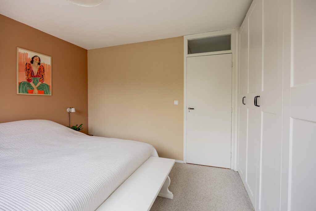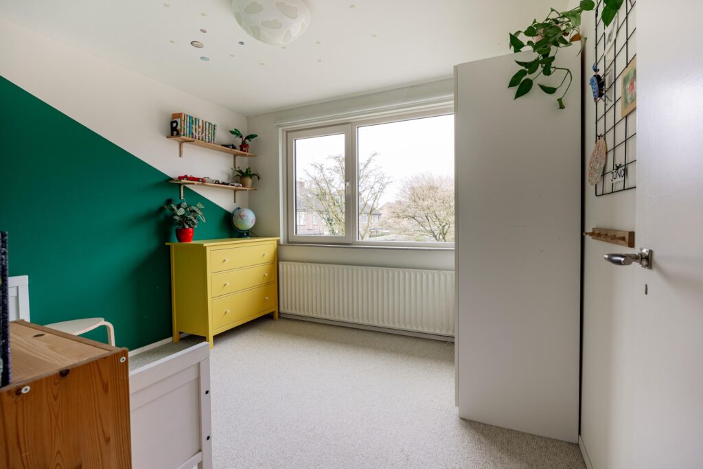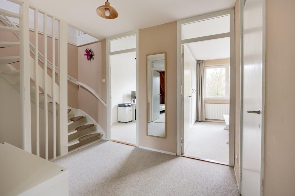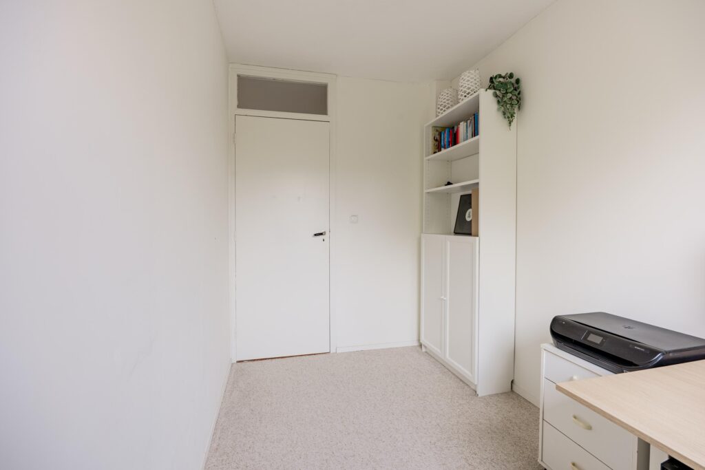 De trapopgang in de hal brengt je naar de overloop op de eerste verdieping met vier goede slaapkamers en de nieuwe badkamer (2021). Aan de voorzijde vind je de ouderslaapkamer en het prettige kantoor. Aan de achterzijde liggen twee goede kinderkamers. Beide slaapkamers zijn keurig afgewerkt en kijken fijn uit op de achtertuin. Door de breedte van de woning vind je op deze verdieping volop ruimte. De moderne, slim vergrote badkamer is comfortabel ingericht met een ruime inloopdouche, een wastafelmeubel en tweede hangtoilet.