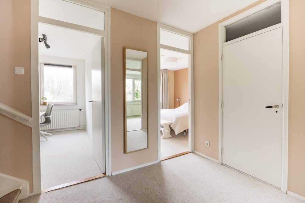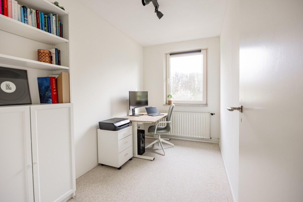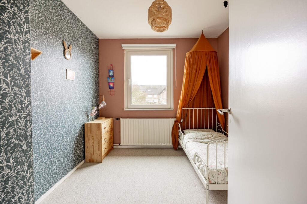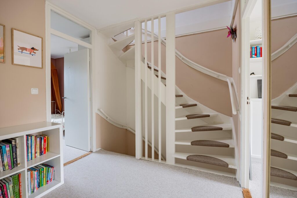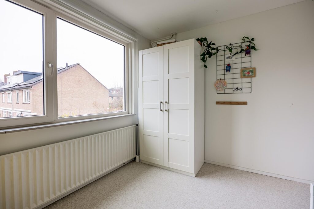 De trapopgang in de hal brengt je naar de overloop op de eerste verdieping met vier goede slaapkamers en de nieuwe badkamer (2021). Aan de voorzijde vind je de ouderslaapkamer en het prettige kantoor. Aan de achterzijde liggen twee goede kinderkamers. Beide slaapkamers zijn keurig afgewerkt en kijken fijn uit op de achtertuin. Door de breedte van de woning vind je op deze verdieping volop ruimte. De moderne, slim vergrote badkamer is comfortabel ingericht met een ruime inloopdouche, een wastafelmeubel en tweede hangtoilet.