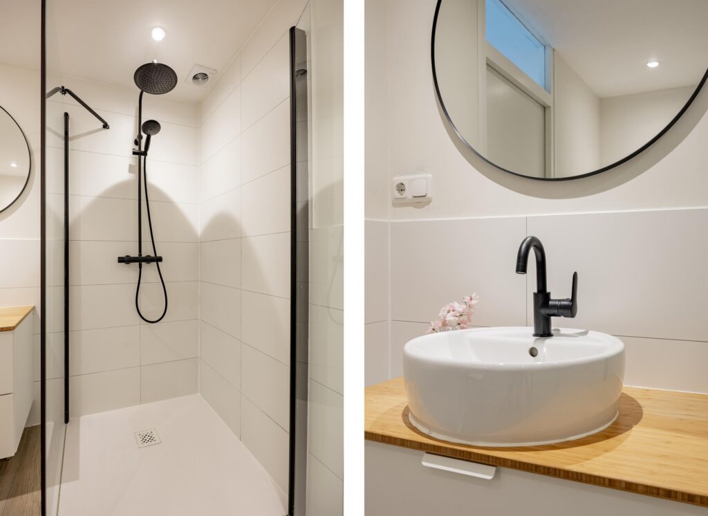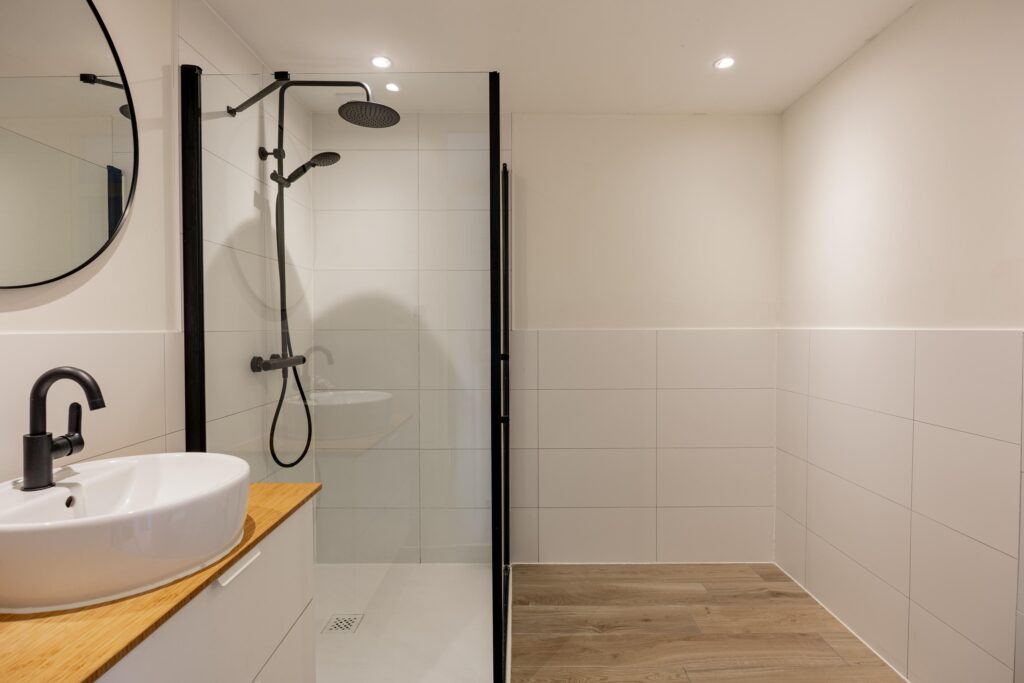 – Moderne, badkamer met wastafelmeubel en inloopdouche;