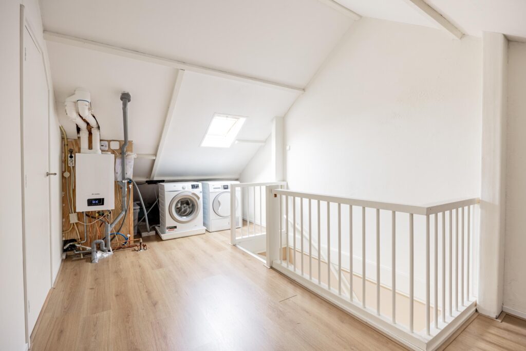 De trap naar de tweede verdieping zorgt voor een echte verrassing wat betreft ruimte en mogelijkheden. Op de ruime voorzolder is aan de achterzijde een wasmachine/droger aansluiting gemaakt. Hier vind je ook de CV-installatie (2025). De ruimte aan de voorkant leent zich uitstekend om een goede functie aan te geven, bijvoorbeeld als werkplek of bergruimte. De vijfde slaapkamer maakt deze verdieping compleet. De kamer loopt over de gehele lengte van het huis, een mooi formaat. De gehele verdieping is afgewerkt met een keurige laminaatvloer.