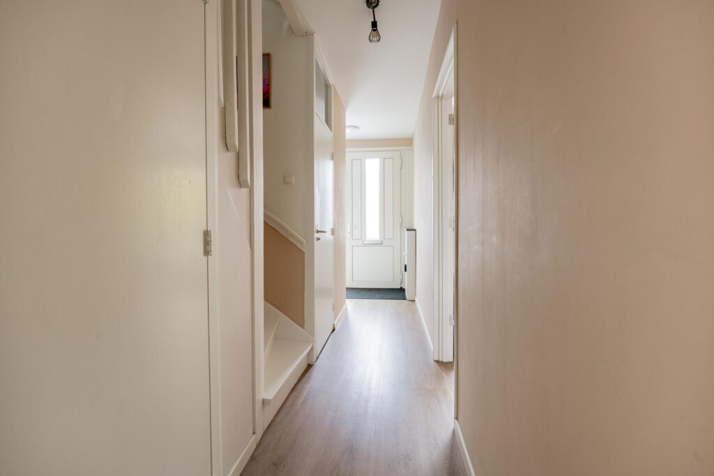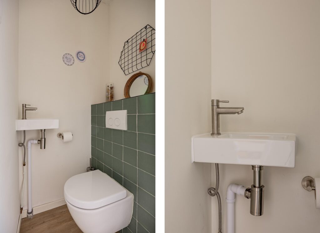 Je komt binnen in de hal met meterkast, toilet, trapopgang en trapkast. Op de vloer ligt een keurige pvc-vloer die doorloopt naar woonkamer en keuken. Op de hele begane grond is vloerverwarming geplaatst voor extra comfort. Het toilet is modern afgewerkt en voorzien van fonteintje.