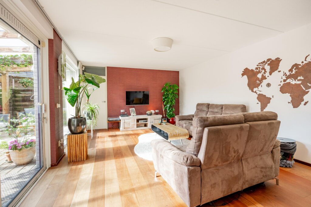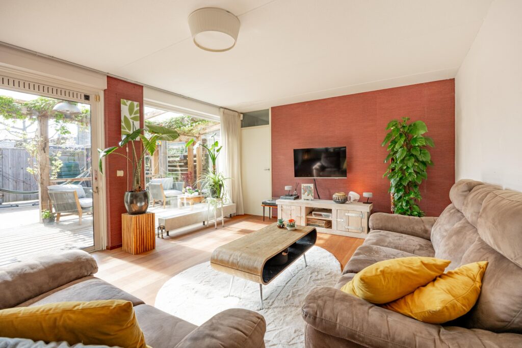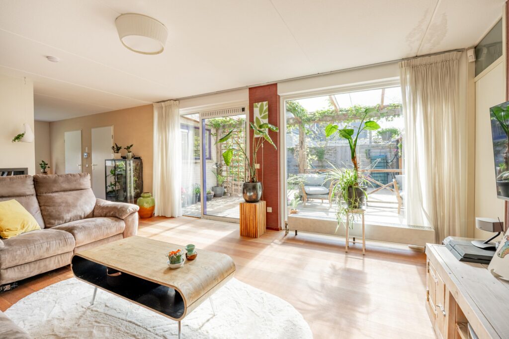 De woonkamer is ruim en licht met een grote glazen pui aan de tuinzijde waarvan één deel is uitgevoerd als schuifpui. Door de opzet van de kwadrantwoning rondom de achtertuin kijk je vanuit vrijwel elke hoek uit op het groen in de zonnige achtertuin.