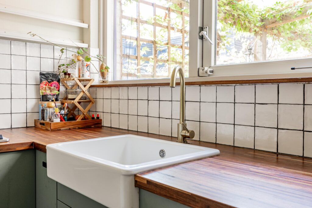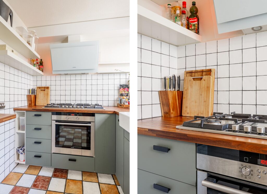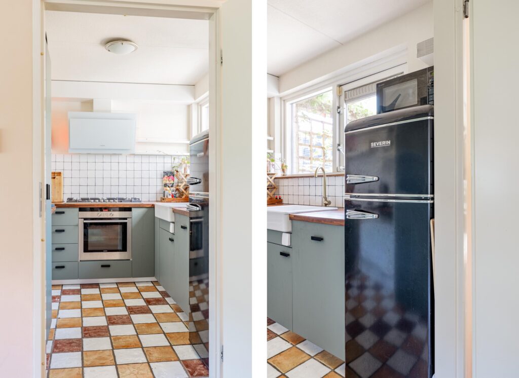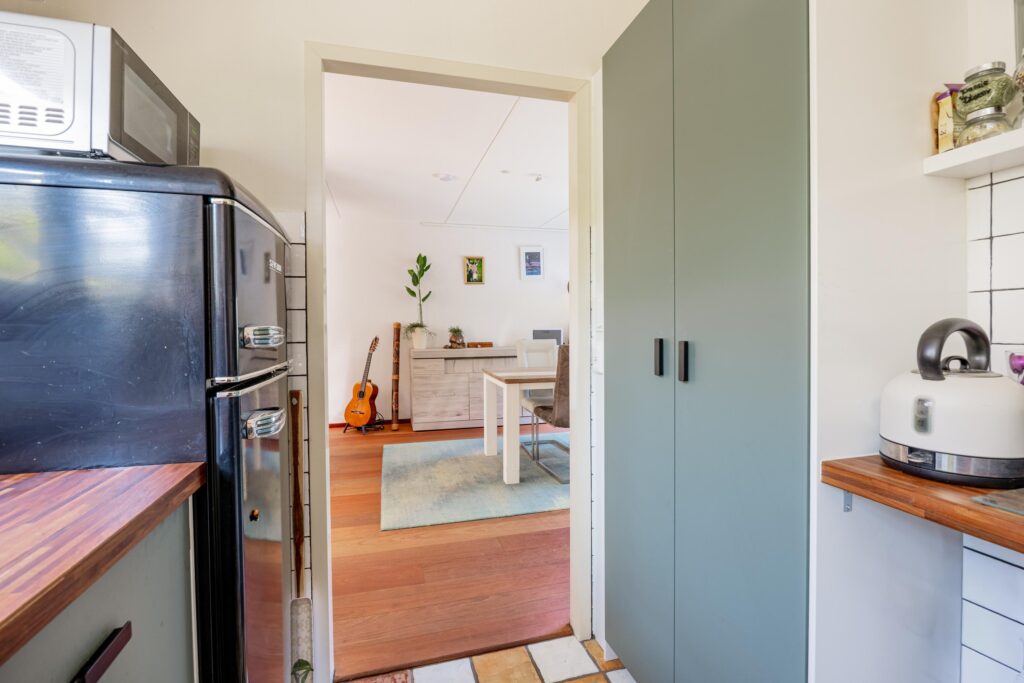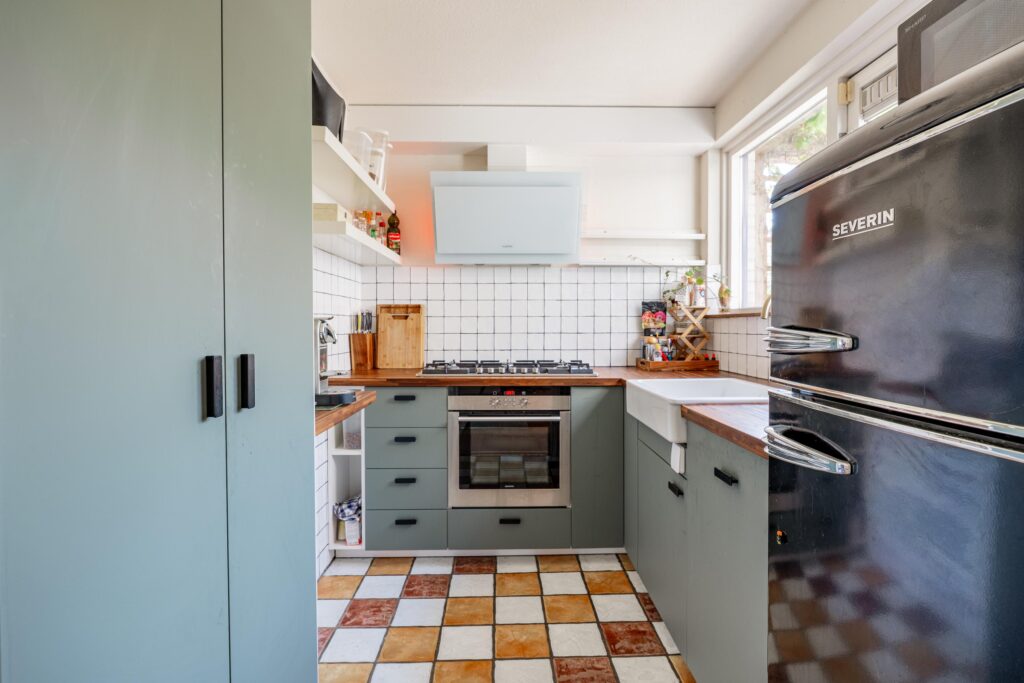 Via de woonkamer bereik je de nette keuken in L-opstelling. De combinatie van een zachte saliegroene kleurstelling met een warm houten werkblad en een karakteristieke porseleinen spoelbak geeft de ruimte een rustige, maar sfeervolle uitstraling. Aan apparatuur is de keuken praktisch ingericht met een 6-pits gaskookplaat, afzuigkap, oven, vaatwasser en een losse koelkast. Vanuit de keuken heb je prettig zicht op de tuin en dankzij het halfgesloten karakter ben je toch dicht bij de eettafel zonder dat je direct hierop uitkijkt of het aanrecht in het zicht ligt.
