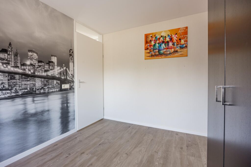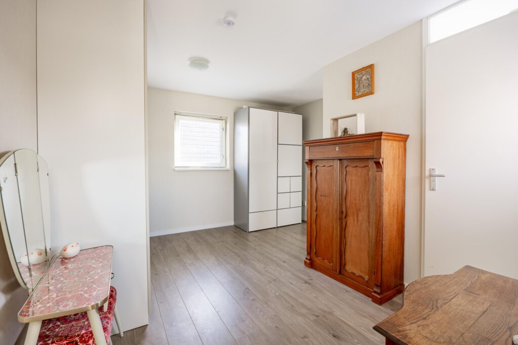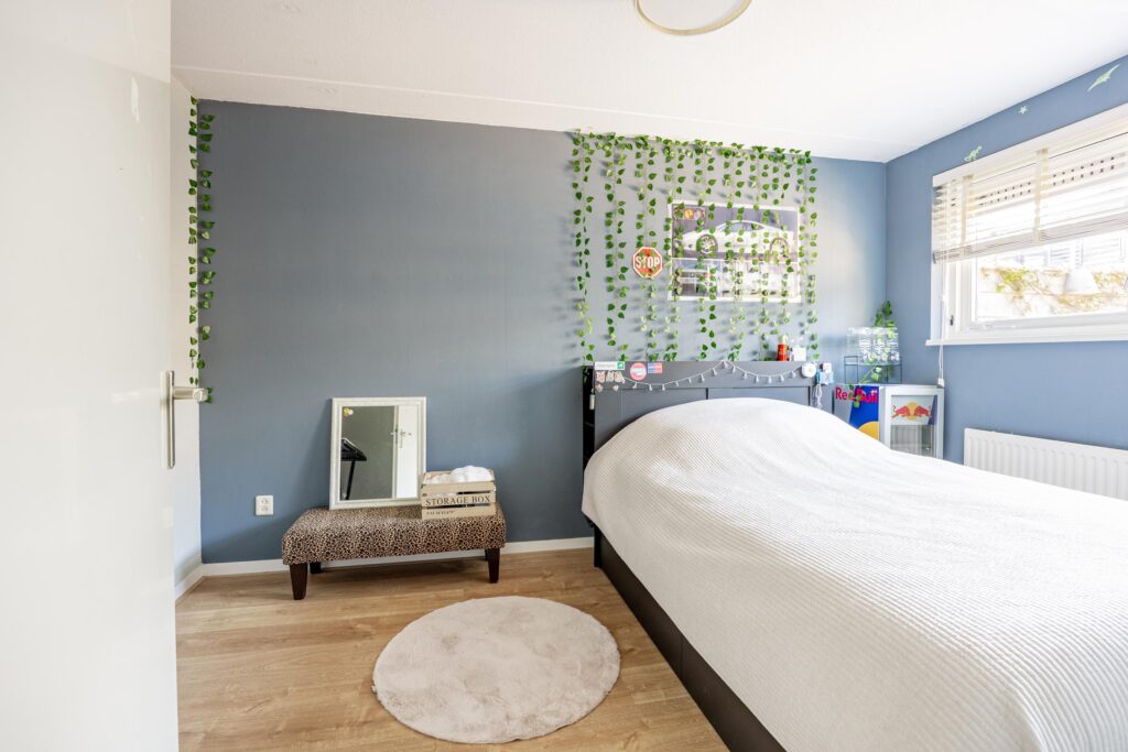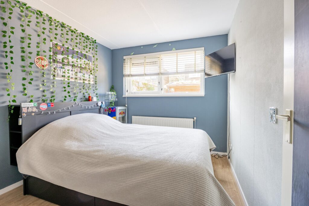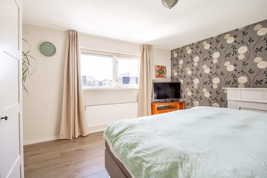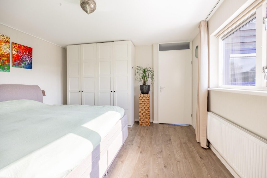 Boven aangekomen bevindt de eerste slaapkamer zich direct aan je linkerzijde. Het is een prettige en goed bemeten kamer van circa 11 m², die dankzij de grote raampartijen heerlijk licht is.