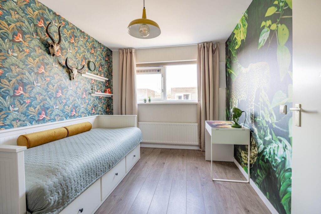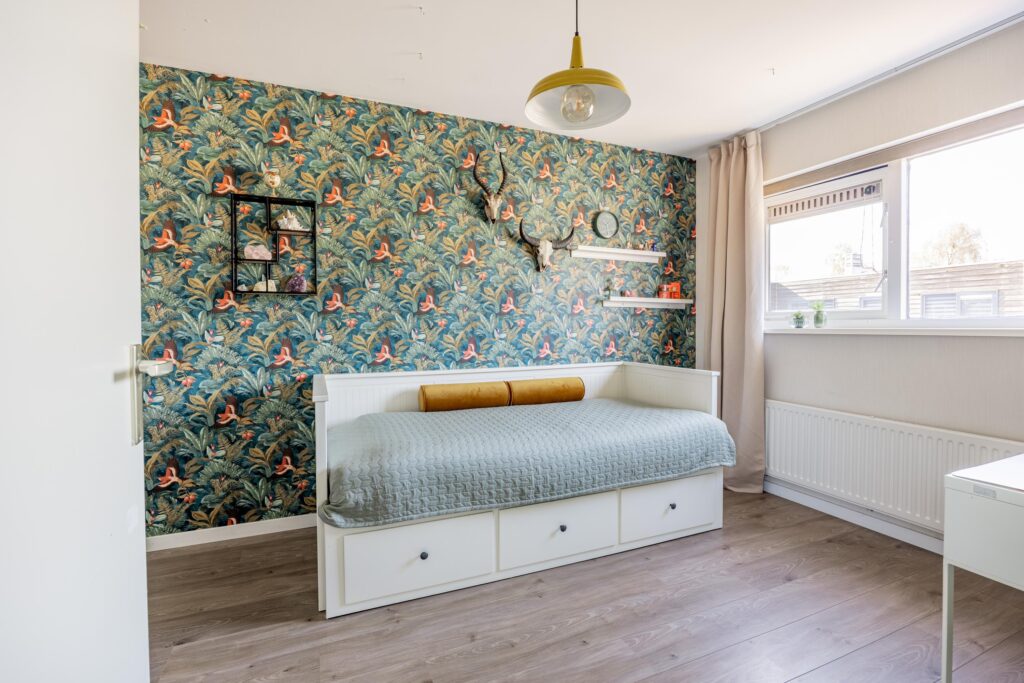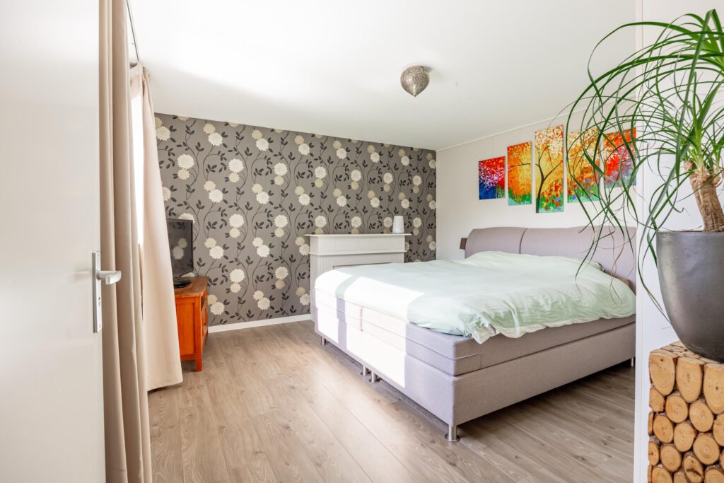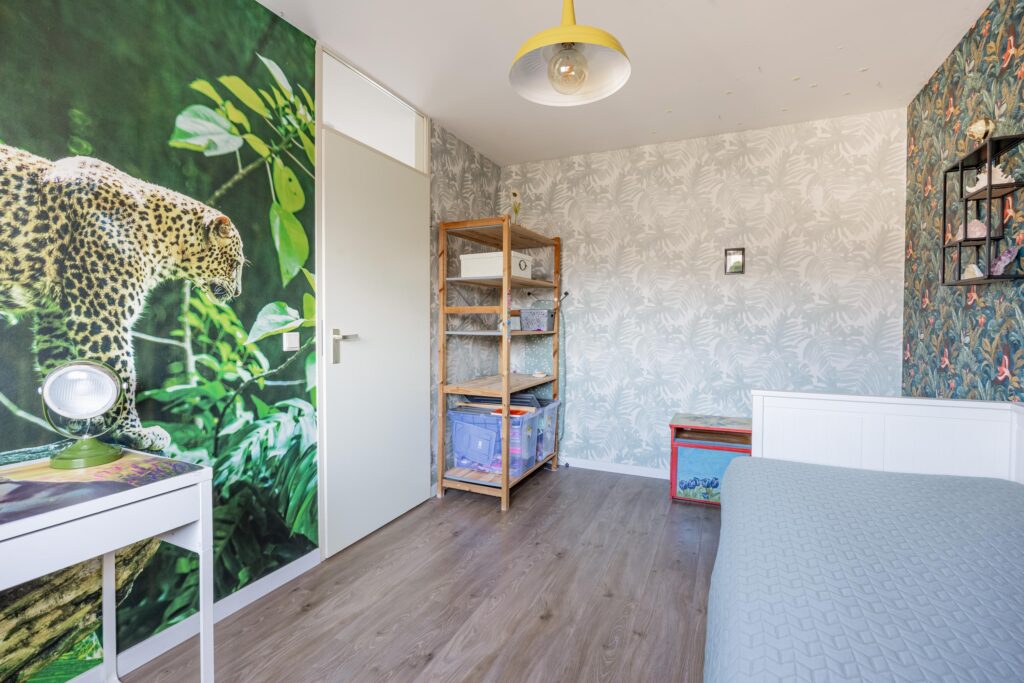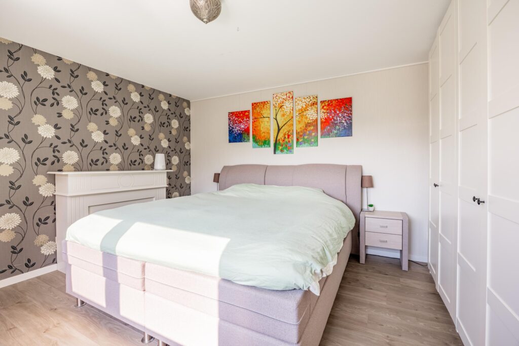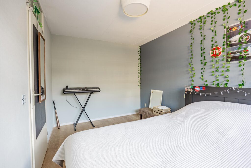Boven aangekomen bevindt de eerste slaapkamer zich direct aan je linkerzijde. Het is een prettige en goed bemeten kamer van circa 11 m², die dankzij de grote raampartijen heerlijk licht is.