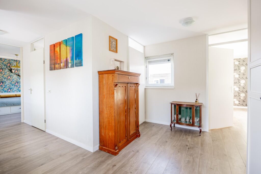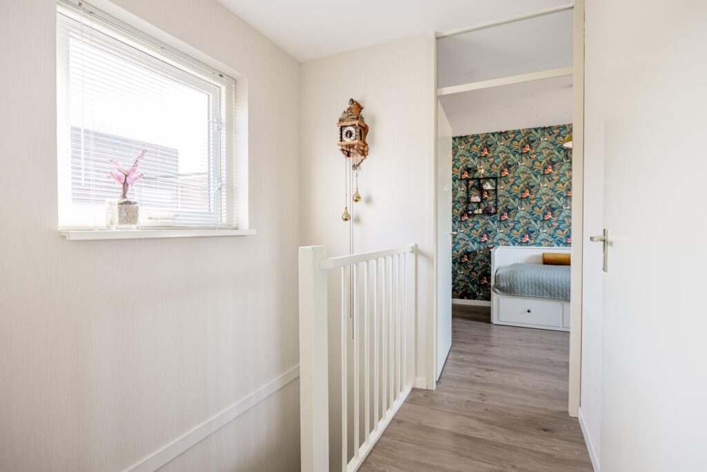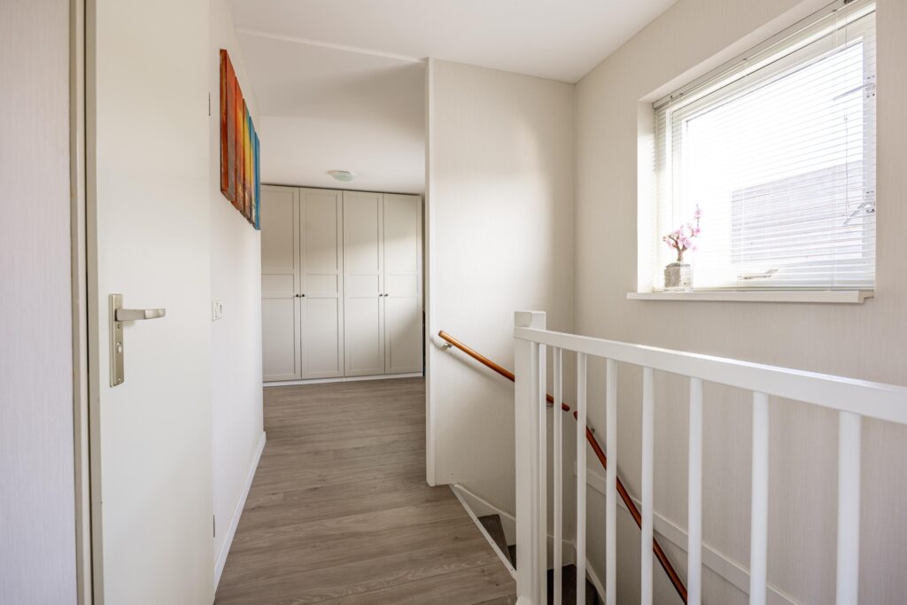 De trap in de hal leidt je naar de eerste verdieping. Hier bevinden zich drie goed bemeten slaapkamers en een badkamer. Op de overloop is bovendien volop ruimte aanwezig om grote garderobekasten te plaatsen, waardoor je hier eenvoudig veel bergruimte kunt creëren. De gehele verdieping is afgewerkt met een mooie, doorlopende laminaatvloer in een lichte tint.
