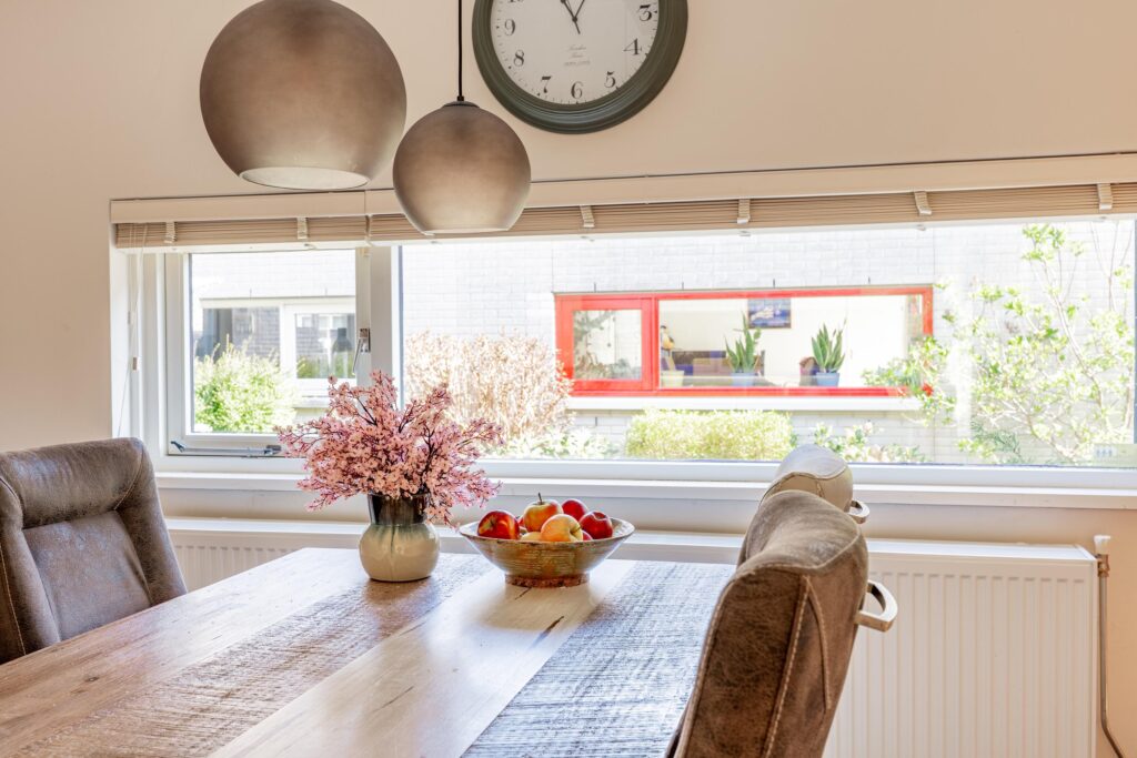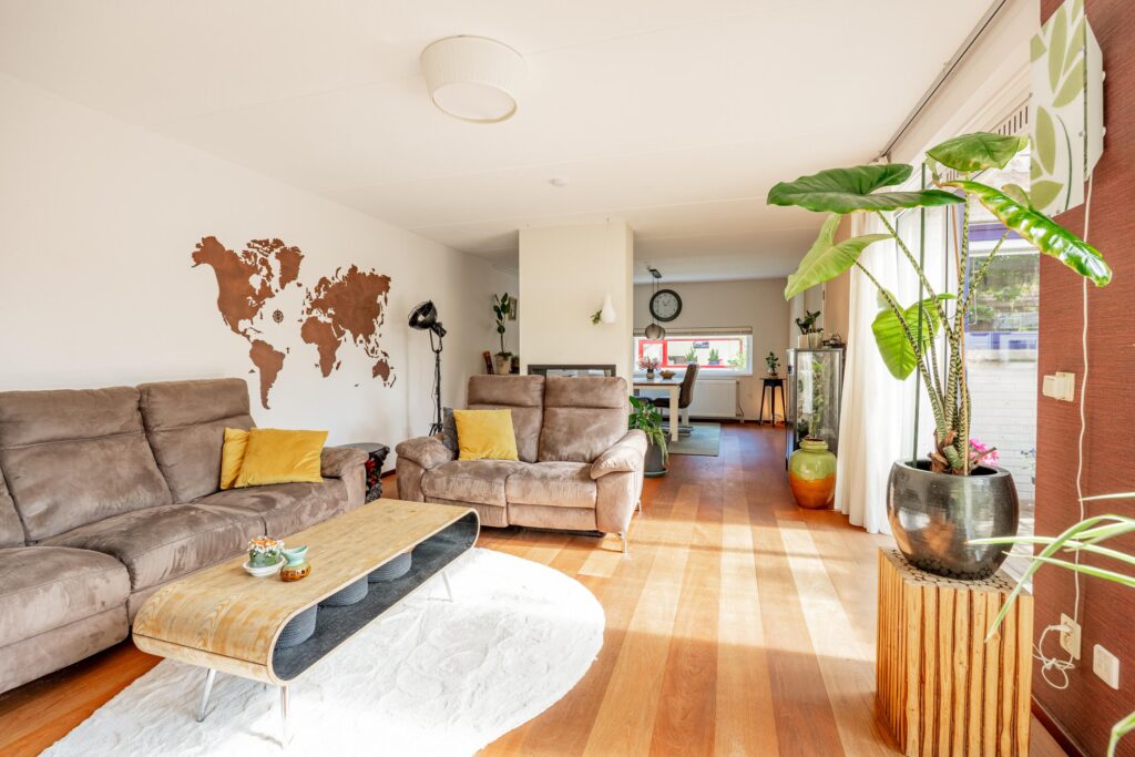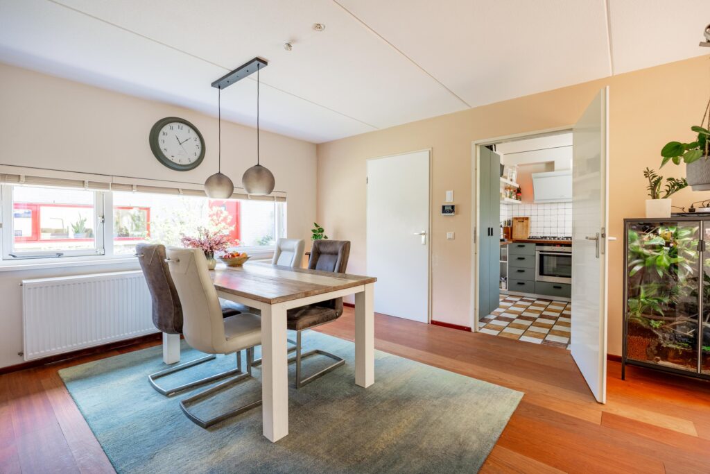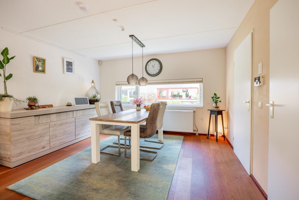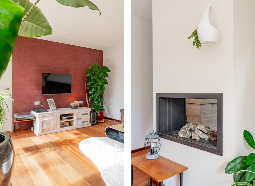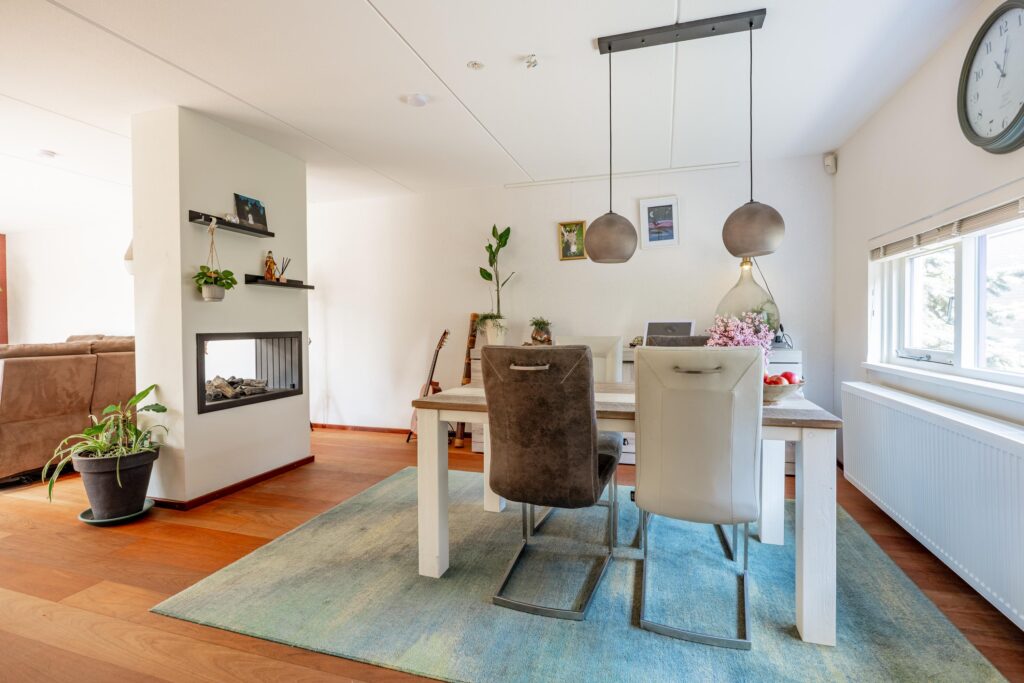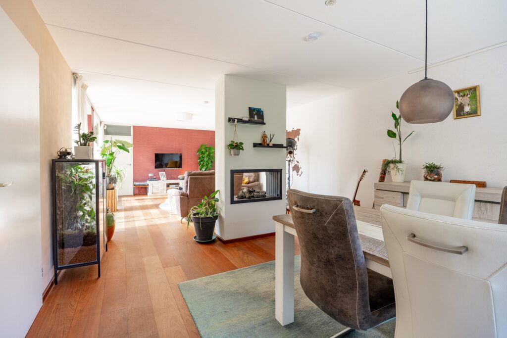 De ruimte is slim ingedeeld met aan de voorzijde plek voor een ruime eettafel ideaal om uitgebreid te tafelen. Centraal in de woning vormt een sfeervolle gashaard een echte blikvanger, waarbij het vuur zowel vanuit het eetgedeelte als vanuit de woonkamer zichtbaar is en extra warmte en sfeer geeft. Aan de tuinzijde is vervolgens volop ruimte voor een ruime zithoek.