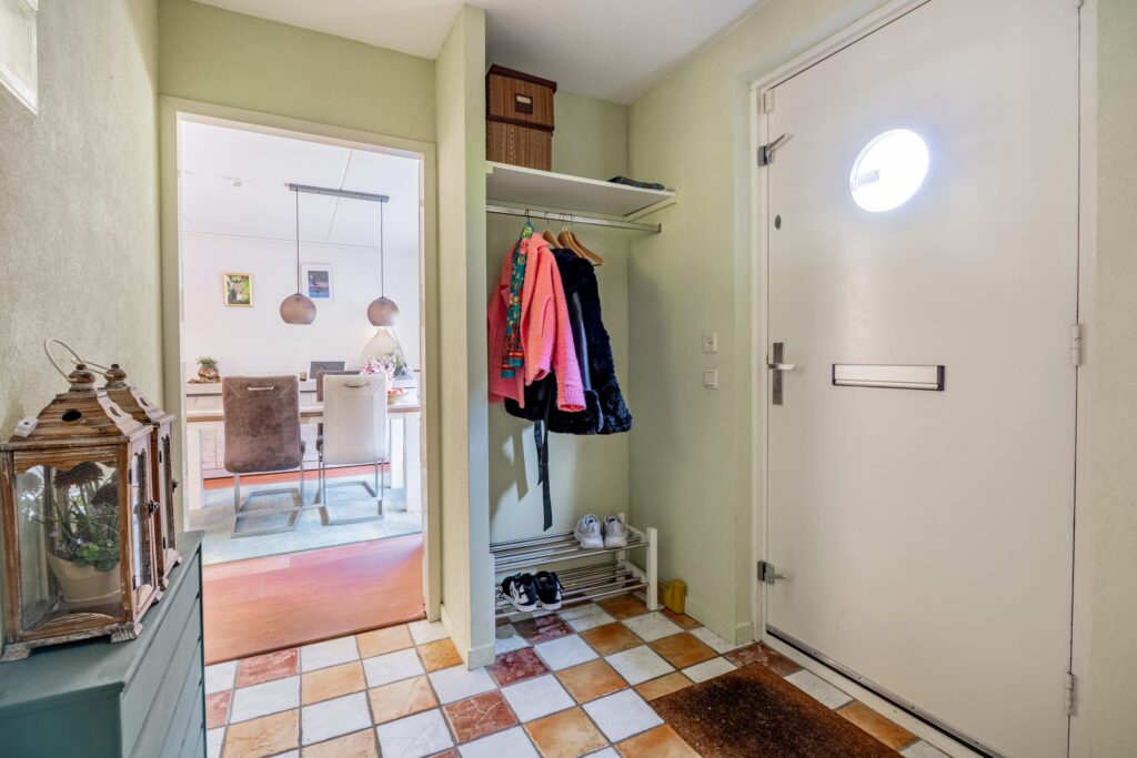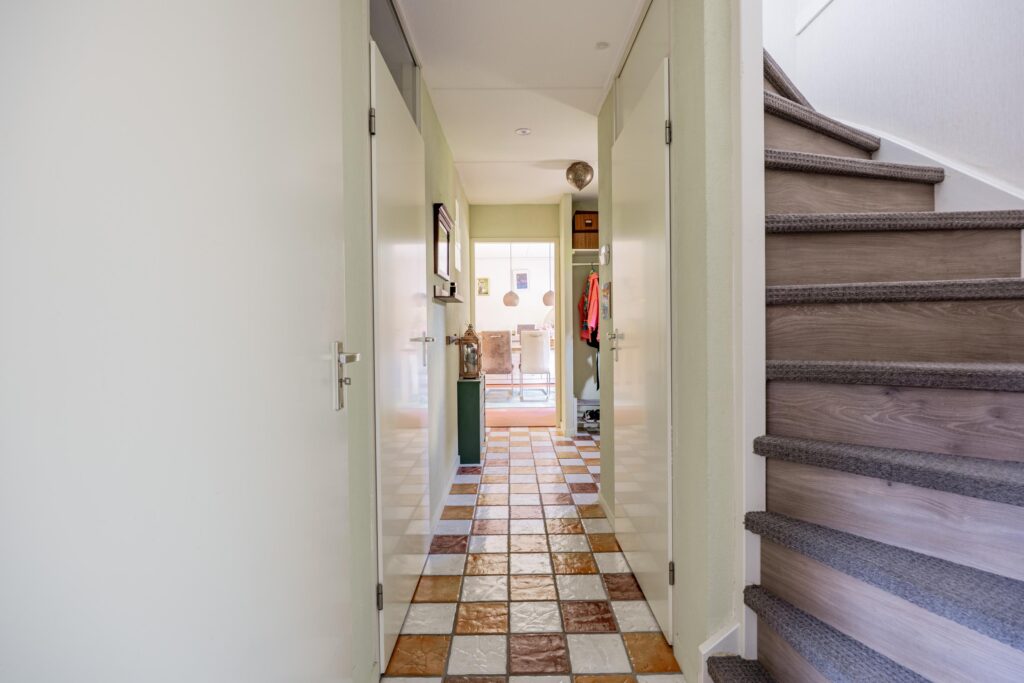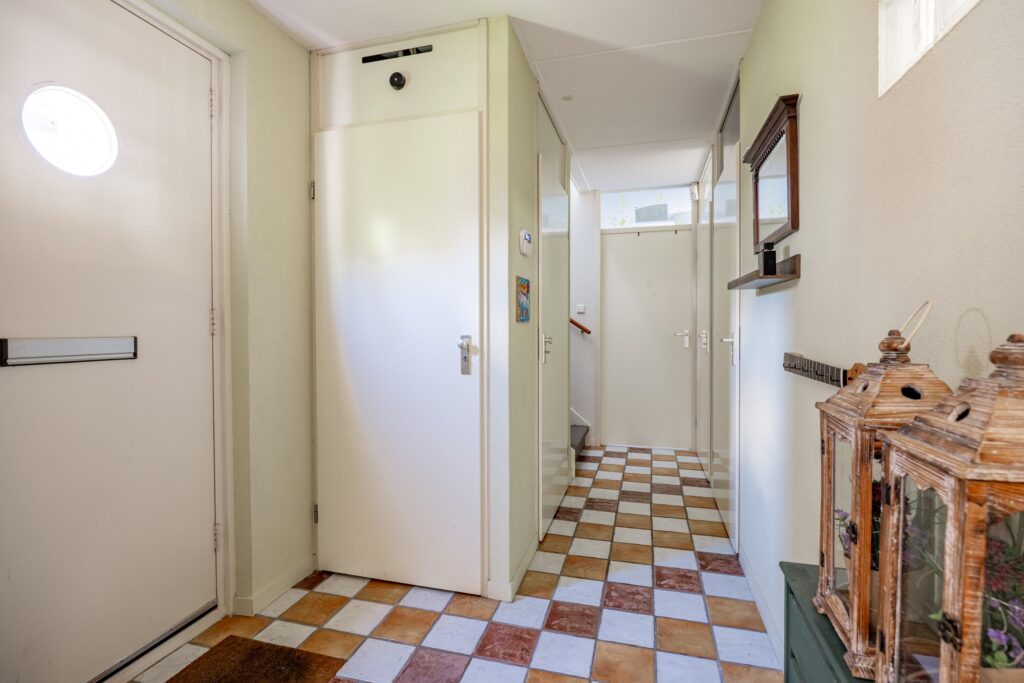 Via de voordeur kom je in de ruime hal met garderobe. Deze geeft aan de linkerkant toegang tot het toilet, berging, trapkast met dubbele berging, (slaap)kamer en woonkamer. Het toilet is ruim van formaat en voorzien van fonteintje. De berging is ruim, heeft direct daglicht en biedt ruimte voor een wasmachine- drogeropstelling.