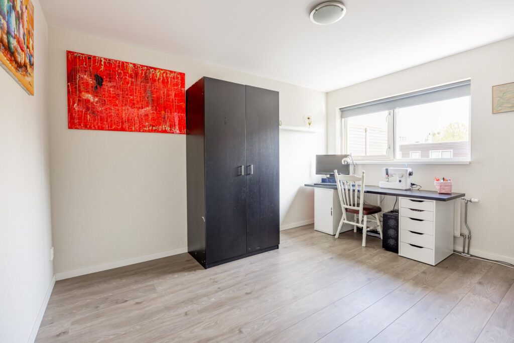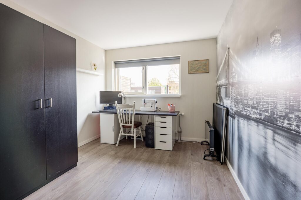 De slaapkamer op de begane grond (ook uitstekend te gebruiken als werkkamer) is van ruim formaat met circa 11 m² en biedt een prettig en vrij uitzicht over de tuin. De ruimte is afgewerkt met een keurige lichte laminaatvloer, wat zorgt voor een frisse en verzorgde uitstraling.