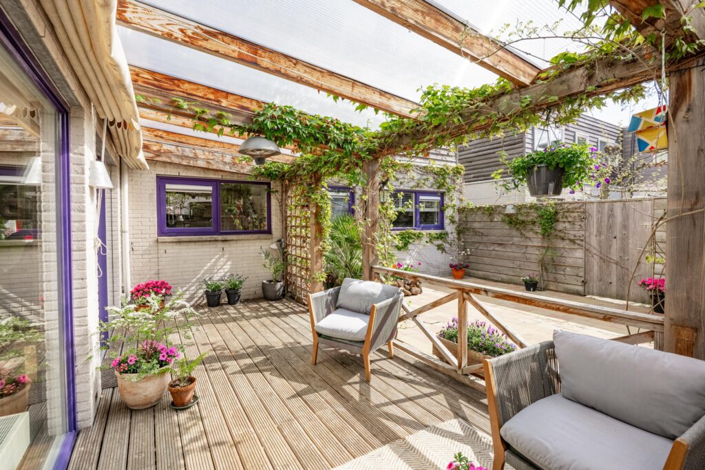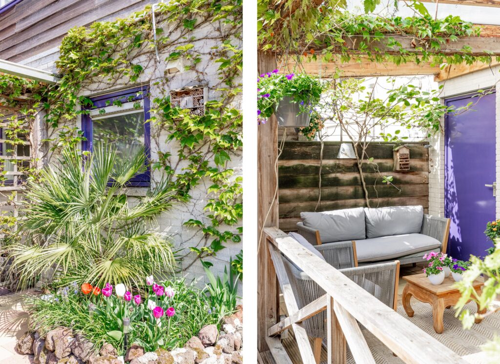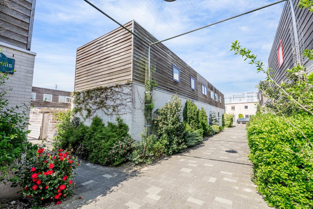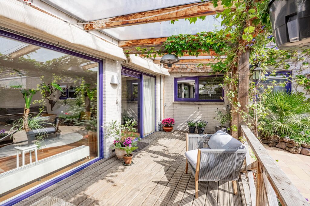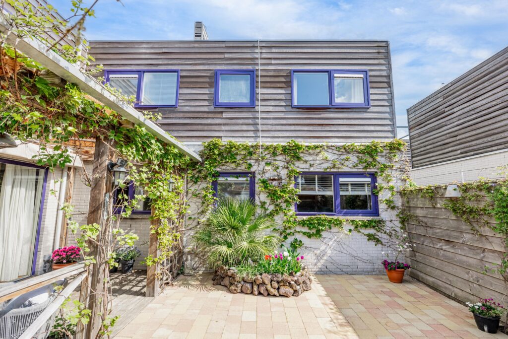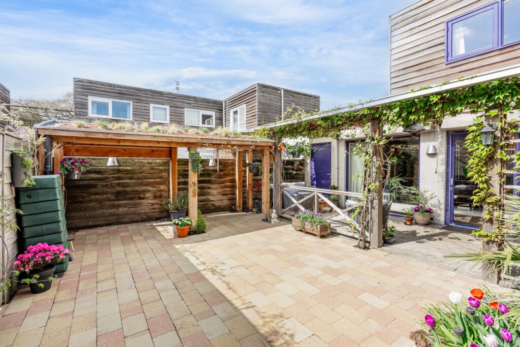 De woonkamer loopt vloeiend over in de tuin en via de schuifpui stap je zo de veranda op, waar je van het vroege voorjaar tot het late najaar heerlijk kunt ontspannen. Dankzij de beschutte ligging voelt de temperatuur in deze binnentuin al snel aangenaam aan. Het is een fijne plek om volop van het buitenleven te genieten, met zowel zonnige als schaduwrijke zitplekken. Direct aan de woning bevindt zich een overkapping, rijkelijk begroeid met diverse klimplanten, die zorgt voor een sfeervolle en beschutte plek om al vroeg in het seizoen buiten te zitten. Schuifdoeken bieden indien gewenst extra schaduw op warme dagen. Achter in de tuin staat bovendien een tweede overkapping met een fraai groen sedum dak, ideaal voor het droog en beschut stallen van fietsen of het opbergen van tuinspullen. Vanuit de tuin is ook de inpandige berging bereikbaar, wat extra praktisch is voor opslag. De achterom bereik je eenvoudig via het pad naast de woning.
