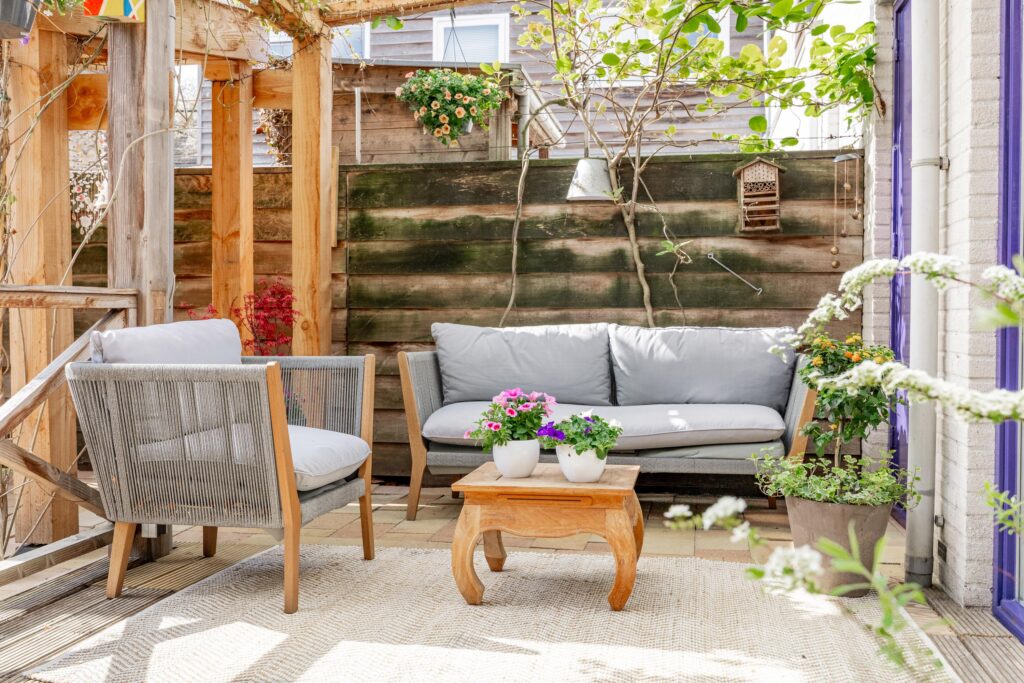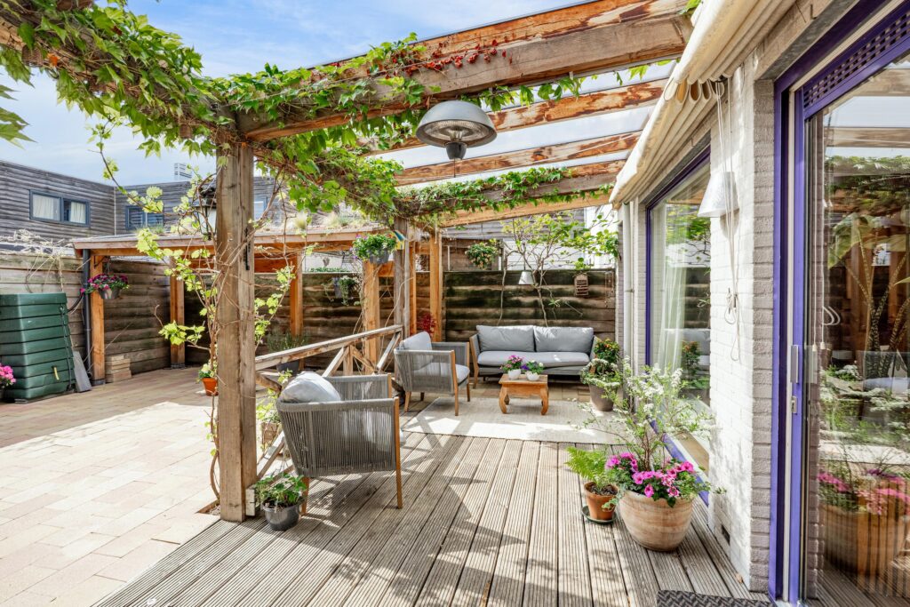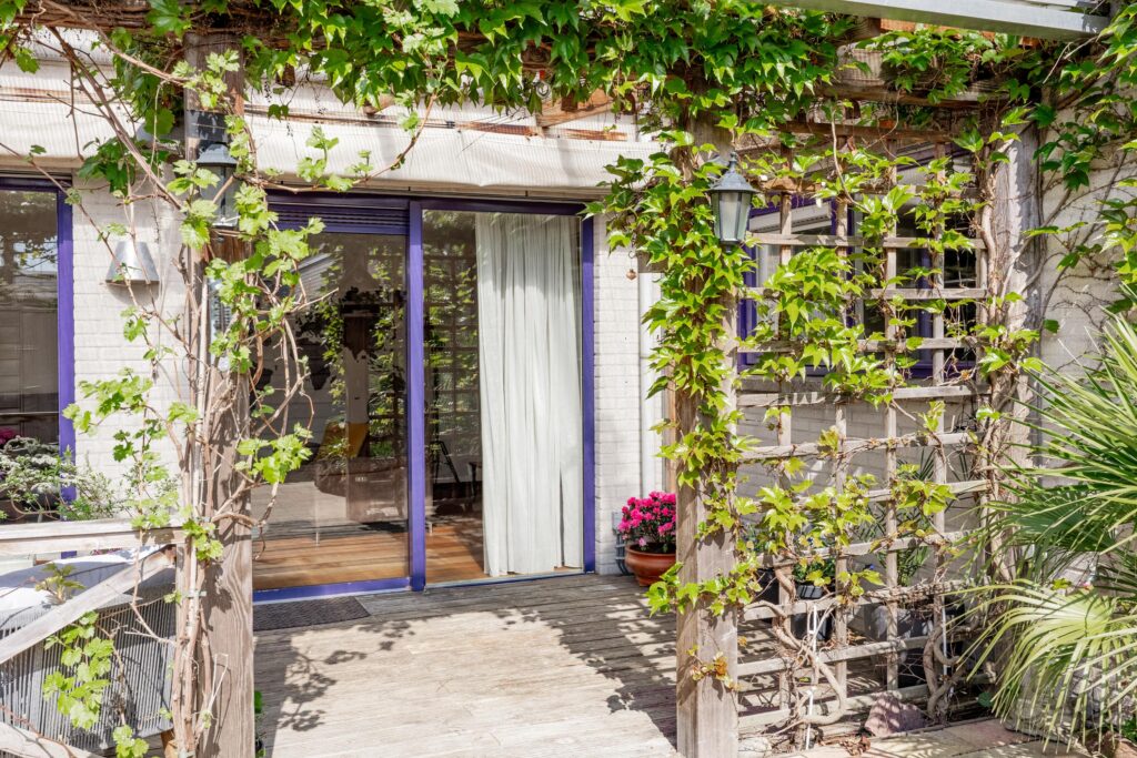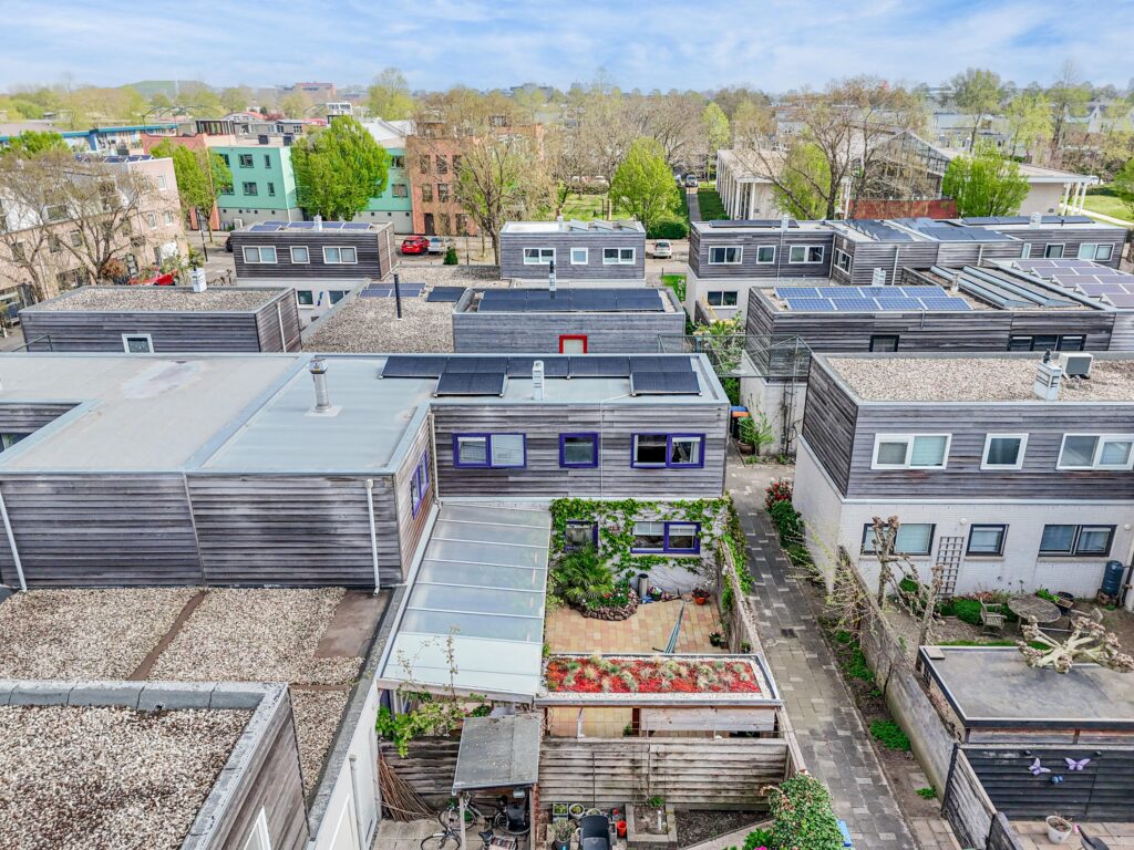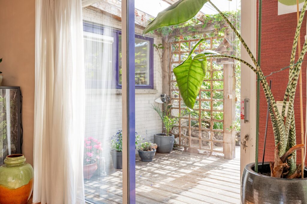 De woonkamer loopt vloeiend over in de tuin en via de schuifpui stap je zo de veranda op, waar je van het vroege voorjaar tot het late najaar heerlijk kunt ontspannen. Dankzij de beschutte ligging voelt de temperatuur in deze binnentuin al snel aangenaam aan. Het is een fijne plek om volop van het buitenleven te genieten, met zowel zonnige als schaduwrijke zitplekken. Direct aan de woning bevindt zich een overkapping, rijkelijk begroeid met diverse klimplanten, die zorgt voor een sfeervolle en beschutte plek om al vroeg in het seizoen buiten te zitten. Schuifdoeken bieden indien gewenst extra schaduw op warme dagen. Achter in de tuin staat bovendien een tweede overkapping met een fraai groen sedum dak, ideaal voor het droog en beschut stallen van fietsen of het opbergen van tuinspullen. Vanuit de tuin is ook de inpandige berging bereikbaar, wat extra praktisch is voor opslag. De achterom bereik je eenvoudig via het pad naast de woning.