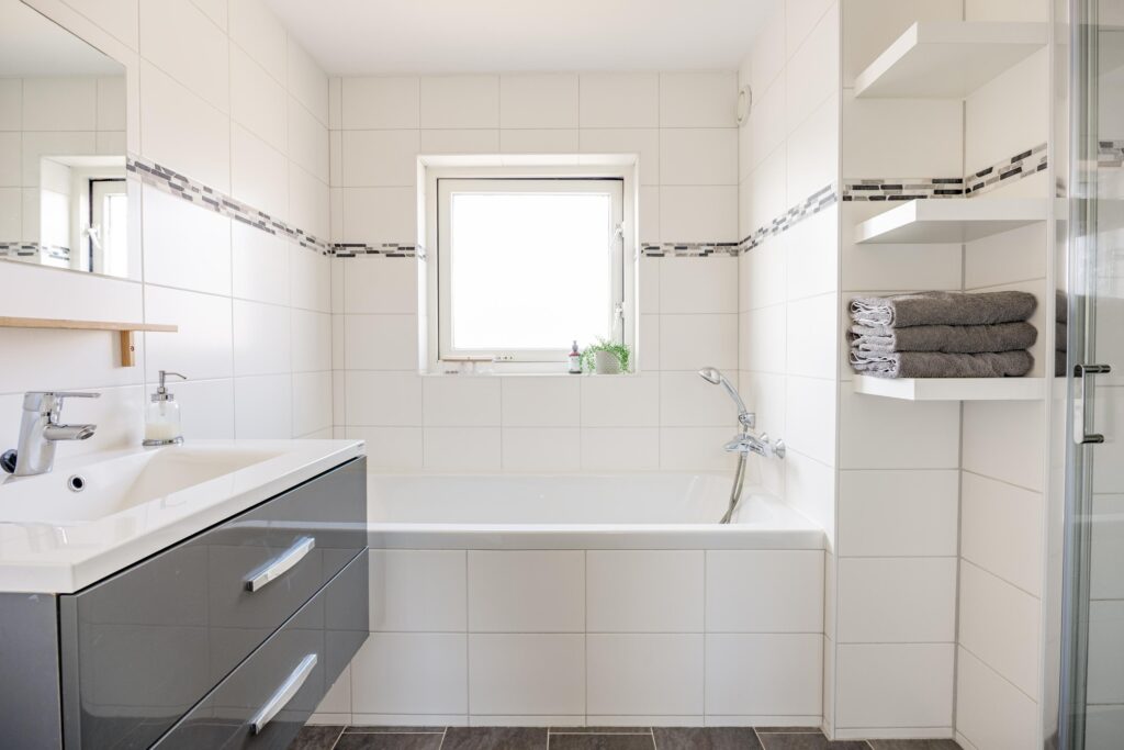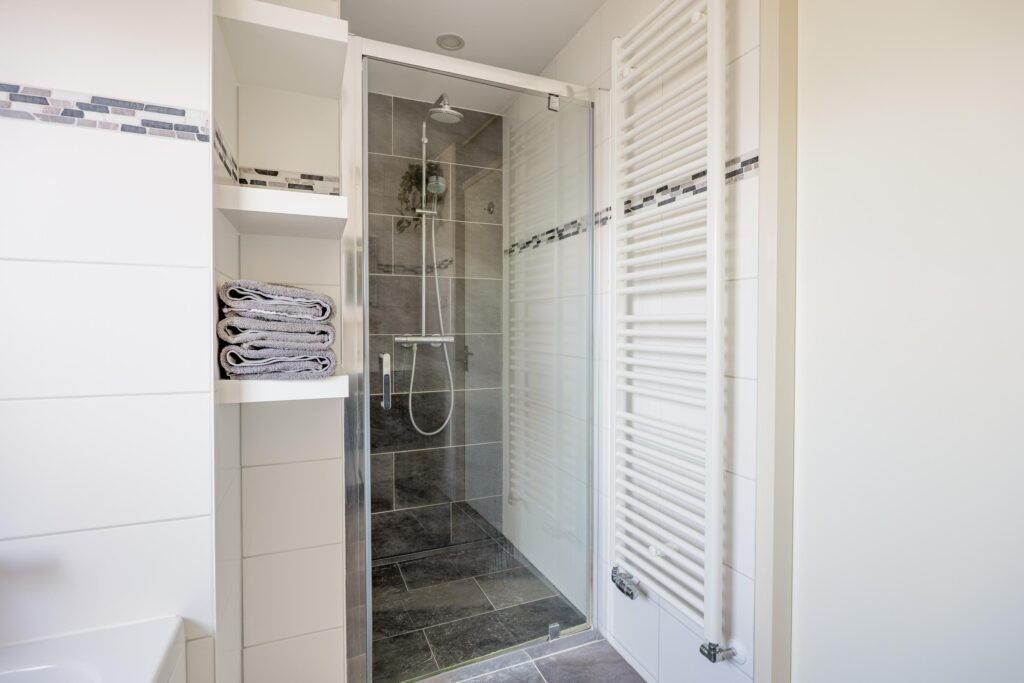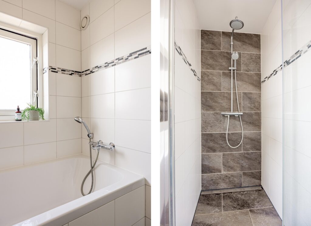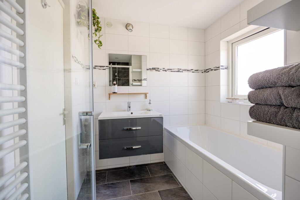 De badkamer bevindt zich centraal in de woning en is uitgevoerd in een frisse wit-grijze kleurstelling. De ruimte is keurig onderhouden en beschikt over een ruime inloopdouche, een comfortabel ligbad en een brede wastafel met voldoende bergruimte. Dankzij het aanwezige raam is er natuurlijke lichtinval en goede ventilatie. Het tweede toilet is separaat gelegen, wat zorgt voor extra comfort en privacy.