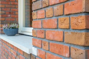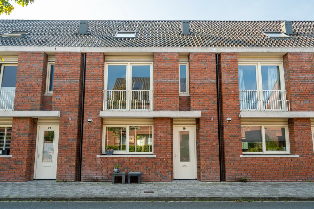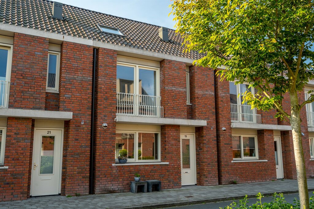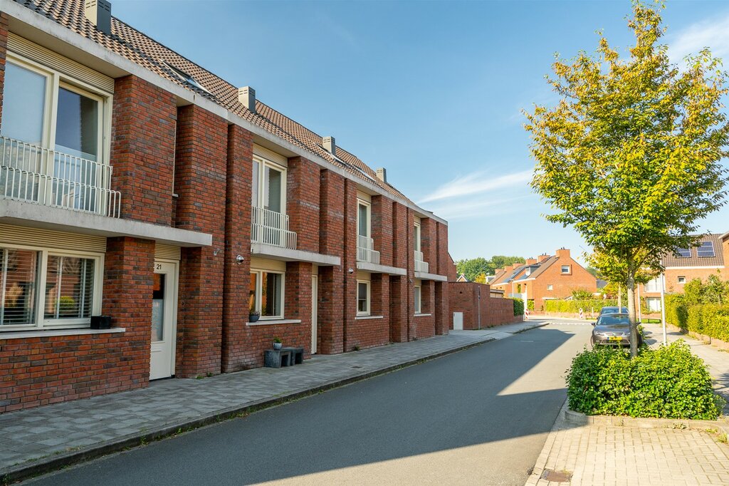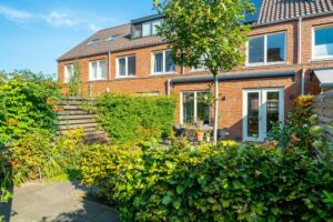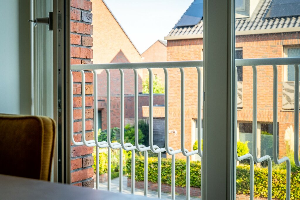 De gevel van de woning is opgetrokken in een mooie warme roodkleurige steen met brede voeg. Dit samen met het Franse balkon en de overstek bij de voordeur geeft het huis een fraaie aanblik.