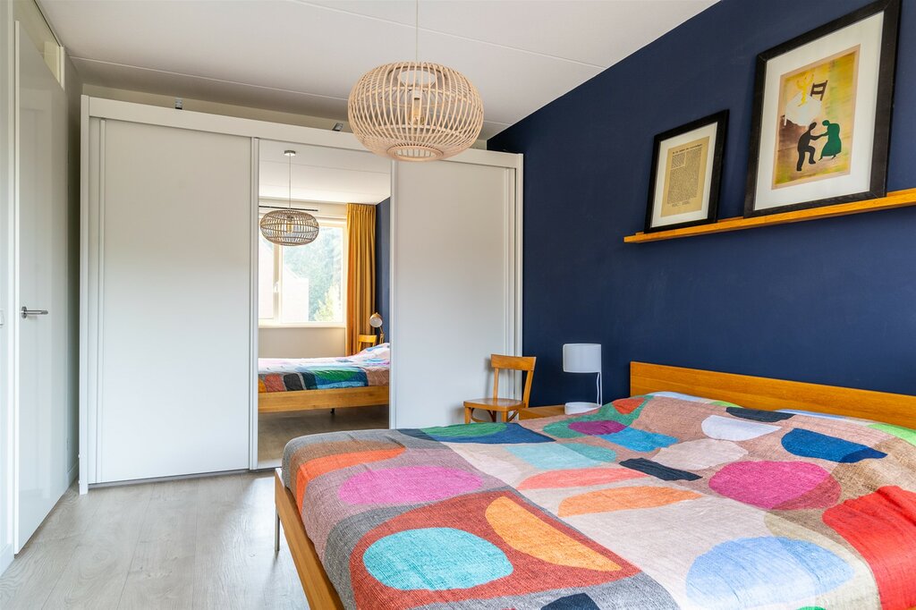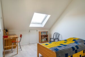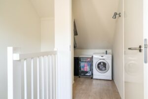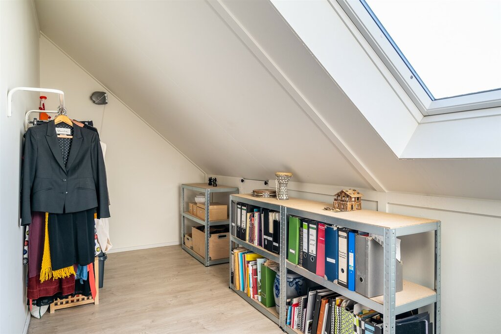 Via een vaste trap kom je op de tweede verdieping welke wederom geheel is afgewerkt. De zolder is al ruim maar kan nog verder vergroot worden door een dakkapel te plaatsen. Ook deze verdieping kent weer een strak vloer- en wandafwerking. De voorzolder biedt veel opbergruimte en kan door de afwerking en indeling ook eenvoudig tot werkkamer of vijfde slaapkamer ingericht worden. De voorzolder geeft op haar beurt weer toegang tot de wasruimte met cv-opstellen en tot de vierde slaapkamer. De slaapkamer heeft een hoge nok en een groot velux dakraam wat ook deze kamer tot een volwaardige slaapkamer maakt.