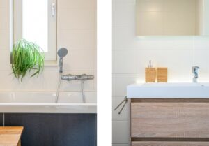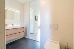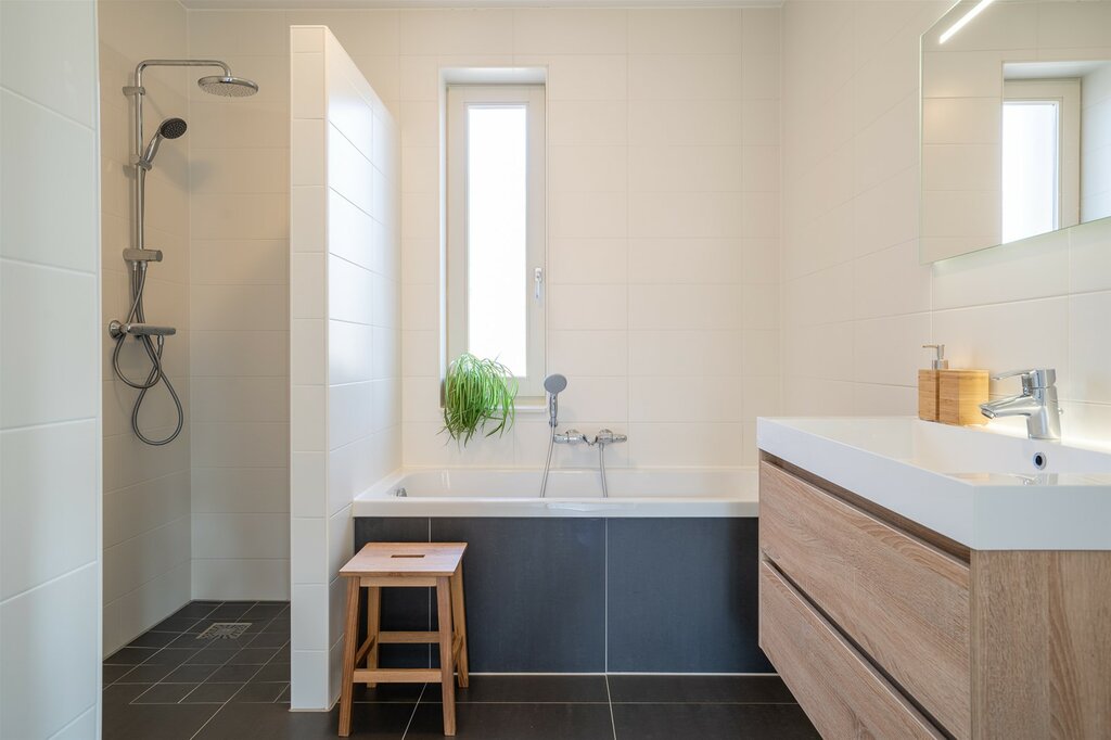 De badkamer is modern afgewerkt in grijs-witte kleurstelling en compleet met een inloopdouche, bad, toilet en dubbele wastafel.