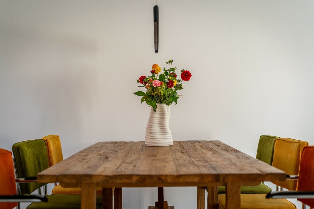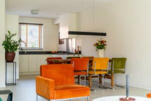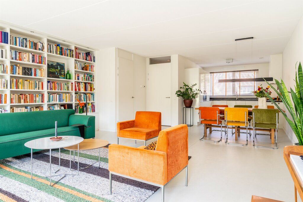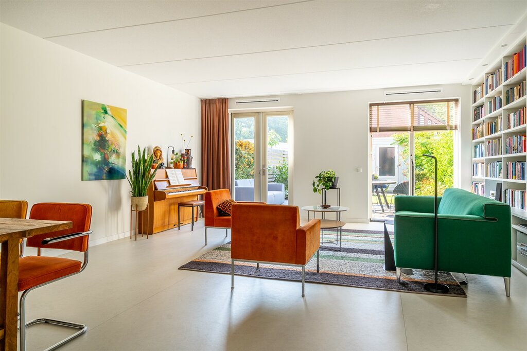 De woonkamer is tuingericht. De neutrale tinten in combinatie met de mooie PVC-vloer is een uitstekende basis om je eigen sfeer te creëren. De woonkamer is van een goed formaat waardoor er zowel ruimte is voor een eetgedeelte als voor een ruim opgezette zithoek. De ramen aan de achterzijde lopen tot aan de grond en zorgen voor een plezierige lichtinval. Met de openslaande deuren wordt de tuin een verlengstuk van je woonkamer.