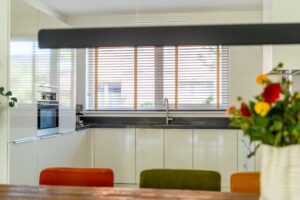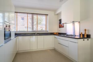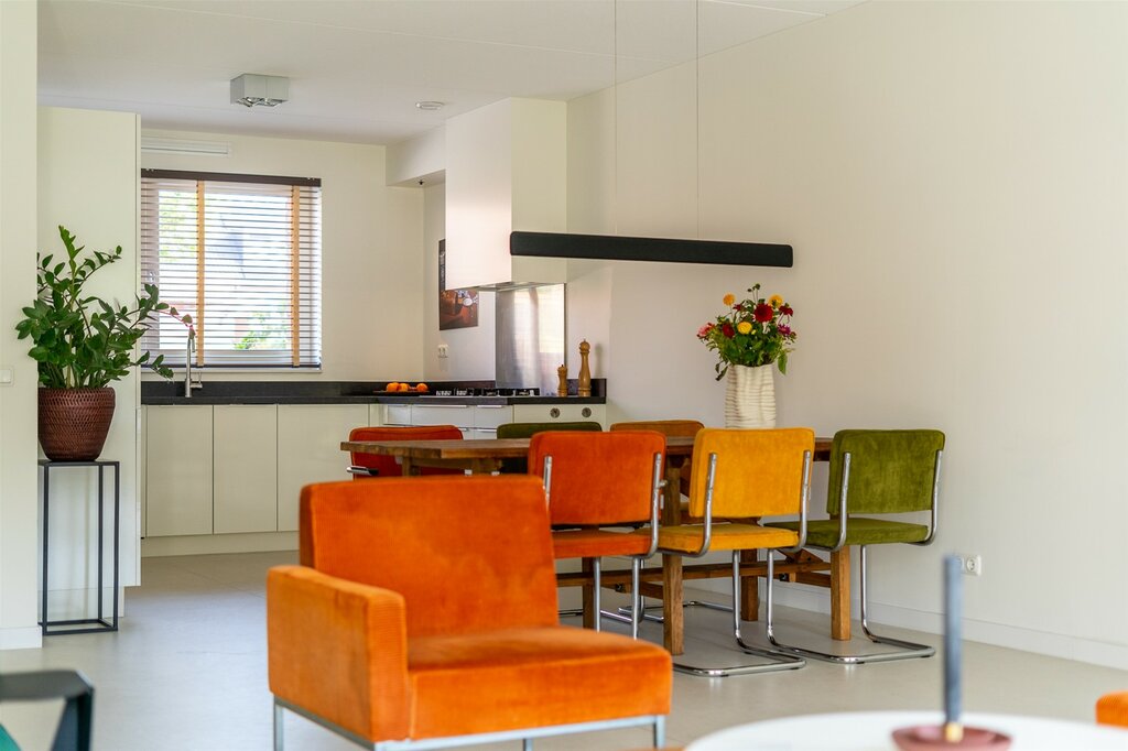 De open keuken is aan de voorzijde van de woning, in hoekopstelling. De keuken heeft veel berg- en werkruimte en diverse inbouwapparatuur waaronder een 5-pits gaskookplaat, koel-/vriescombinatie, vaatwasmachine en combi-oven. Door het grote raam over de volle breedte van het aanrecht heb je fijn daglicht naar binnen schijnen en is het een heerlijke plek om te kokkerellen. Ook bij de keuken is er aandacht gegeven aan de afwerking zoals het natuurstenen blad, de mooie designspotjes en een strakke koof boven het aanrecht.