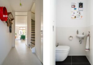 Via de entree kom je in de hal met toilet in strakke zwart-witte betegeling, meterkast, trapopgang naar boven en toegang naar de woonkamer.