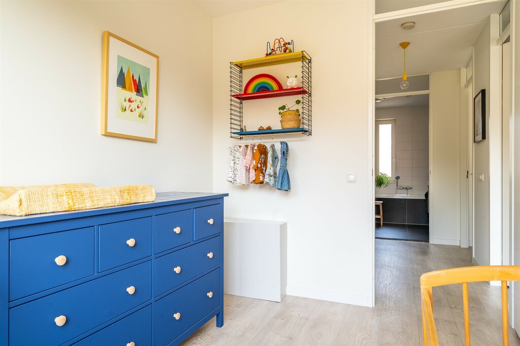 Op de eerste verdieping bevinden zich drie slaapkamers en een ruime badkamer. Twee slaapkamers bevinden zich aan de achterzijde en de derde ligt aan de voorzijde, met het Franse balkon. De kamers zijn allemaal opvallend ruim en licht door de grote raampartijen. Ook op deze verdieping ligt een strakke en keurig doorgelegde PVC-vloer.
