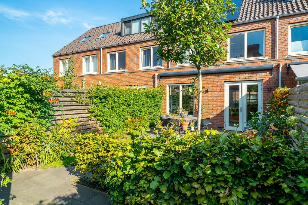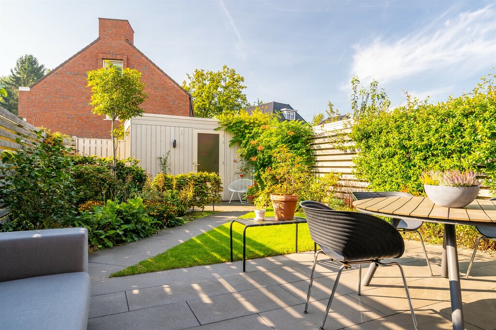 De tuin ligt op het zuiden en is zeer netjes en strak aangelegd met verschillende borders en sierbestrating. De wijze van bestrating geeft een ruimtelijk gevoel en geeft zowel voor- als achter in de tuin een plekje om te zitten. Achterin de tuin staat nog een fraai houten berging voor je tuinspullen en fietsen.
