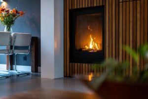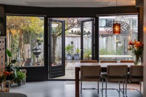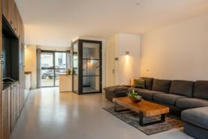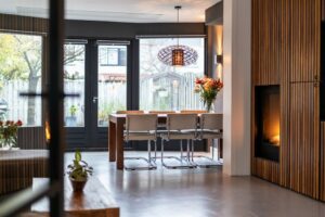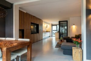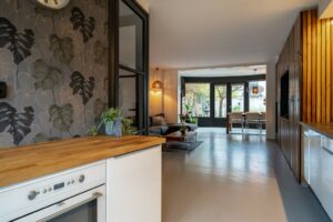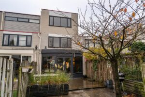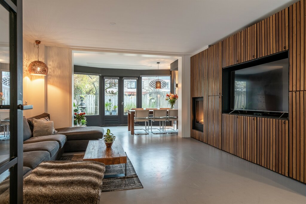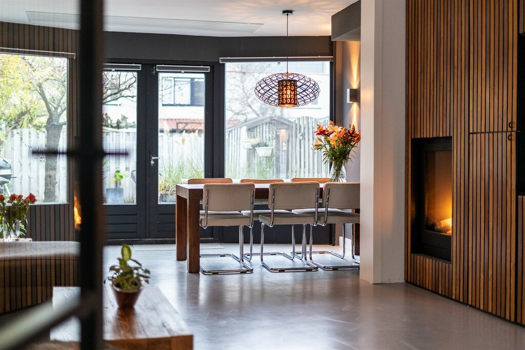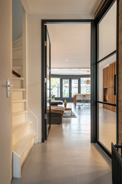 Bij binnenkomst in de hal valt de mooi glazen deur in zwart frame in het oog. Loop je door de deur dan sta je in de sfeervolle woonkamer met aan voorzijde de lichte keuken. Aansluitend de woonkamer met inbouwkast en de gezellige haard. In de uitbouw is een gezellige eetkamer gecreëerd. De openslaande deuren geven veel lichtinval vanuit de tuin.