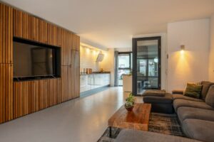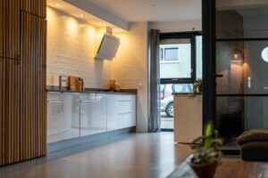 – Mooie strakke keuken en inbouwkast met gashaard