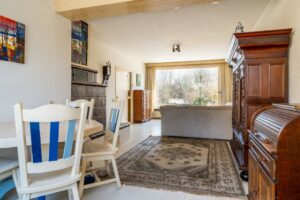 Via de entree kom je in het voorportaal met meterkast en de deur naar de hal. De hal geeft toegang tot het toilet met fonteintje, de kelderkast, de trap naar de eerste verdieping, de keuken en tot de woonkamer. De woonkamer is opvallend licht door de grote raampartijen aan de voor- en achterzijde. In de kamer bevindt zich de gezellige tegelkachel met warmtemuur. De halfopen keuken ligt in de uitbouw aan de achterzijde en hier is ruimte voor een gezellige woonkeuken.