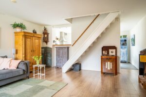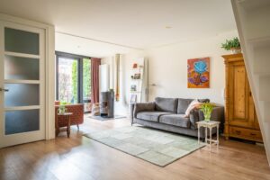 De woonkamer is voorzien van strak gestucte wanden en een mooie laminaatvloer. Door het betrekken van de voormalige vide bij de woonkamer (2018) is er extra leefruimte gecreëerd aan de voorzijde.