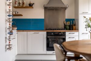 Aan de achterzijde bevindt zich de halfopen woonkeuken. Door de opengewerkte muur bij het aanrecht houd je toch contact met de woonkamer en kijk je fijn weg. De huidige eigenaar heeft de keuken in 2013 geheel vernieuwd. Er ligt vloerverwarming en een keurige plavuizen vloer. De keuken heeft veel opbergruimte en alle benodigde inbouwapparatuur zoals 5-pits gasfornuis, oven, vaatwasser en grote koel-vriescombinatie. De keramieken gootsteen, het houten werkblad en de blauw geglazuurde wandtegeltjes maken het geheel af.
