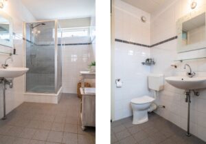 De eerste slaapkamer (ca 9m2) is gesitueerd aan de achterzijde met prettig zicht op de achtertuin. Naast deze slaapkamer bevindt zich de goed onderhouden badkamer welke beschikt over toilet, wastafelmeubel en douchecabine.