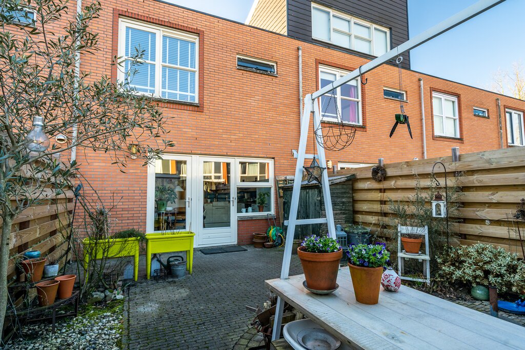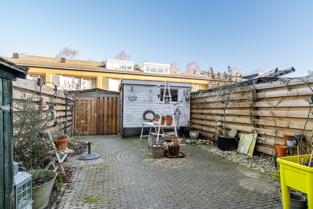 Via de achterdeur in de keuken kom je in de tuin. De op het noorden gelegen tuin heeft door de diepte van 11 meter een gunstige zonligging. In de achtertuin is er een houten berging voor het opbergen van tuinkussens, tuingereedschap of de fietsen. De woning heeft een gedeelde achterom, waardoor je je fiets makkelijk stalt.