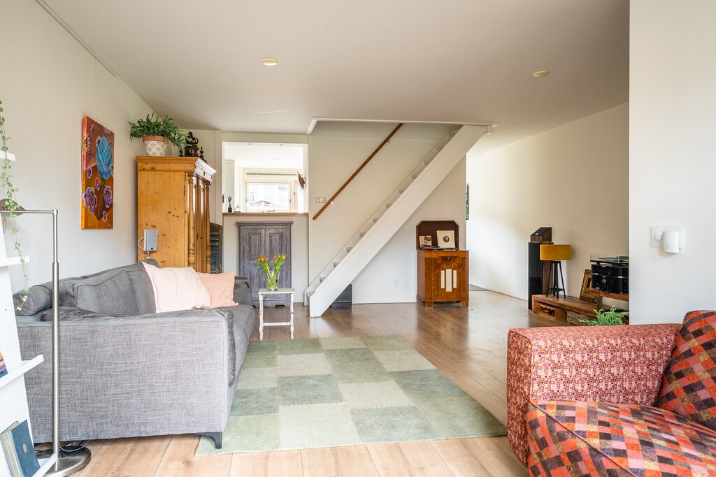 De woonkamer is voorzien van strak gestucte wanden en een mooie laminaatvloer. Door het betrekken van de voormalige vide bij de woonkamer (2018) is er extra leefruimte gecreëerd aan de voorzijde.