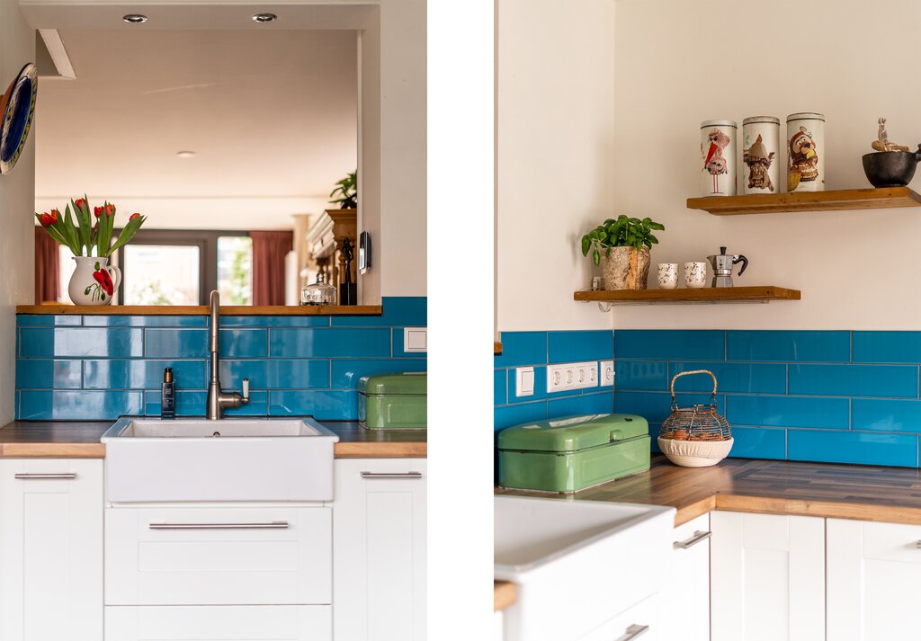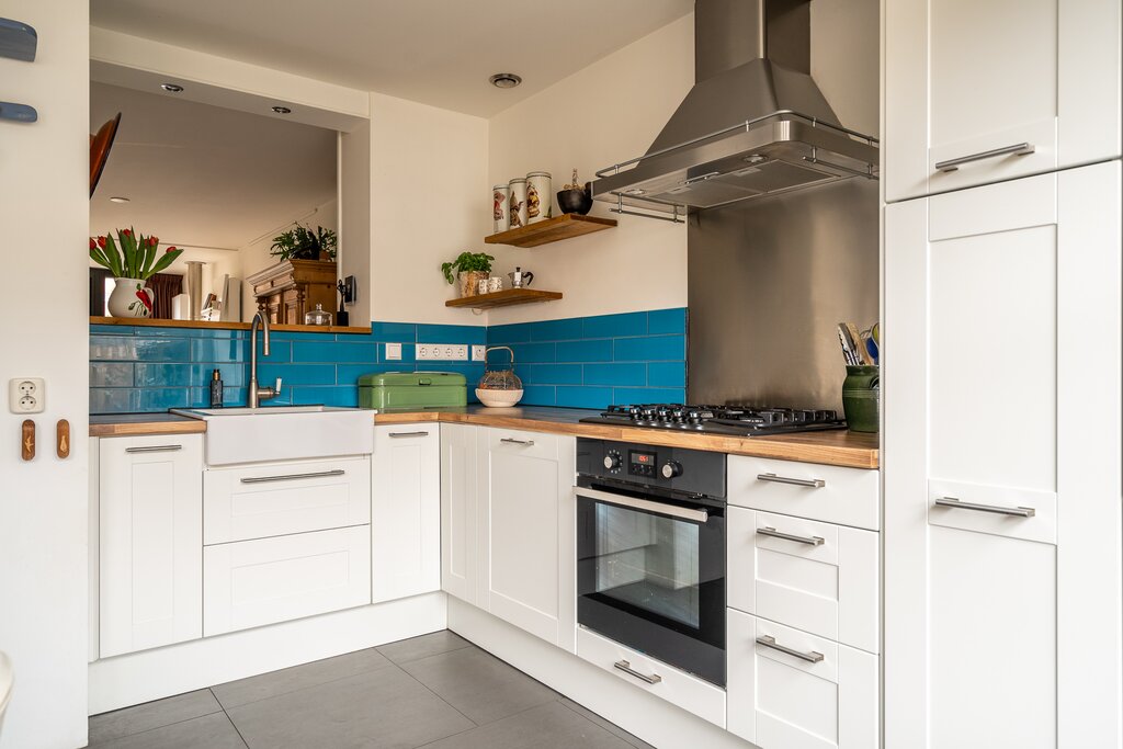 Aan de achterzijde bevindt zich de halfopen woonkeuken. Door de opengewerkte muur bij het aanrecht houd je toch contact met de woonkamer en kijk je fijn weg. De huidige eigenaar heeft de keuken in 2013 geheel vernieuwd. Er ligt vloerverwarming en een keurige plavuizen vloer. De keuken heeft veel opbergruimte en alle benodigde inbouwapparatuur zoals 5-pits gasfornuis, oven, vaatwasser en grote koel-vriescombinatie. De keramieken gootsteen, het houten werkblad en de blauw geglazuurde wandtegeltjes maken het geheel af.