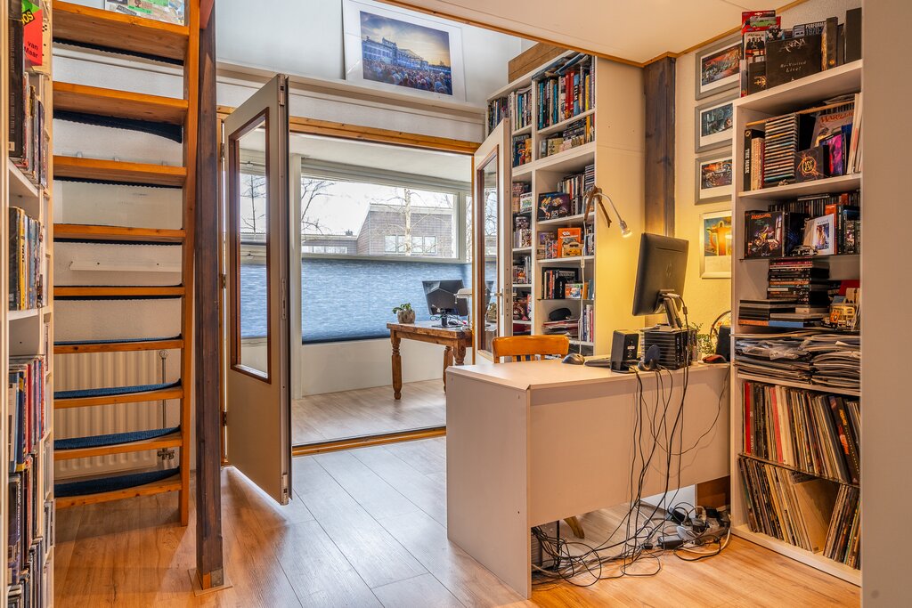 Aan de voorzijde van de woning bevinden zich nog twee kamers van 6 m2 en 12 m2. De grootste slaap-/werkkamer heeft door zijn plafondhoogte van ruim 3,4 meter een ruimtelijk en speels karakter. Deze kamer geeft toegang tot de extra gecreëerde ruimte van 10 m2 (voormalige vide) aan de voorzijde met optimale lichtinval door de grote raampartij. Dit is de ideale plek voor een werkruimte of hobbyruimte. Trek je deze ruimte liever bij een van de slaapkamers, dan kan dat natuurlijk ook.