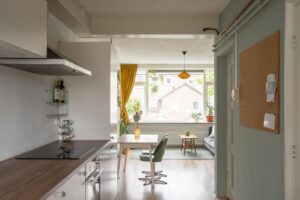 De woonkamer geeft toegang tot de open keuken, gelegen aan de achterzijde van het appartement met een toegangsdeur naar de tuin. De keuken is in 2017 volledig vernieuwd en voorzien van inductiekookplaat, combi-oven en koel/vriescombinatie. Tevens vind je hier de aansluiting voor de wasmachine, keurig weggewerkt achter een kastdeurtje. In een vaste kast zit de cv-opstelling.