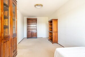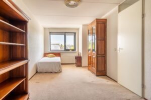 Aan de voorzijde van het appartement bevinden zich twee ruimte slaapkamers van 19m2 en 10m2. De hal geeft toegang tot de badkamer met bad, en wastafel. De badkamer is netjes onderhouden, in lichte kleurstelling en hier is meer dan voldoende ruimte om een grote kast of wellicht een inloopdouche te plaatsen. Naast de badkamer ligt het separaat toilet alsook een aparte berging met wasmachine aansluiting.