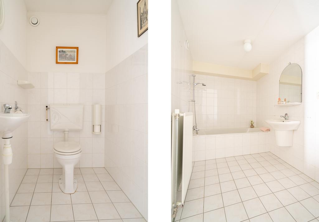 Aan de voorzijde van het appartement bevinden zich twee ruimte slaapkamers van 19m2 en 10m2. De hal geeft toegang tot de badkamer met bad, en wastafel. De badkamer is netjes onderhouden, in lichte kleurstelling en hier is meer dan voldoende ruimte om een grote kast of wellicht een inloopdouche te plaatsen. Naast de badkamer ligt het separaat toilet alsook een aparte berging met wasmachine aansluiting.