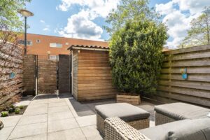 De tuin ligt op het zuiden en belooft vele zonnige uurtjes. De tuin is voorzien van keurige bestrating, kleine borders met beplanting en achterop het perceel staat een houten berging.