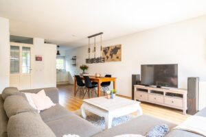 De woonkamer is ruim en licht door de grote glaspui aan de achterzijde. Ook zit hier een handige en ruime trapkast. Vanuit de woonkamer heb je toegang tot de zonnige tuin op het zuiden.